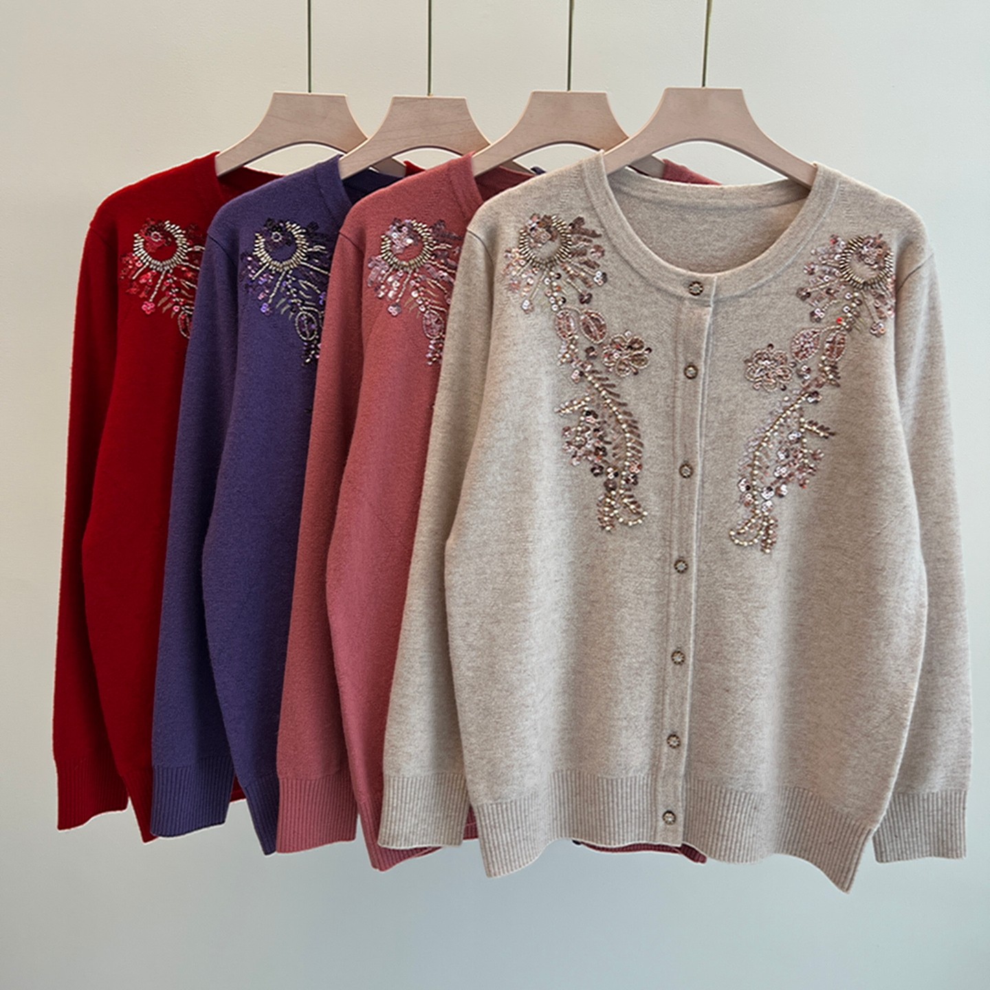 100%纯羊毛衫秋冬奶奶装针织开衫新款中老年女装妈妈绣花毛衣外套