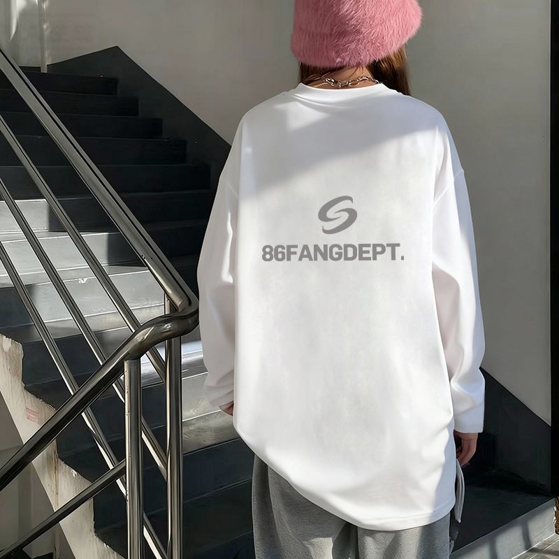 高级感印花中长款纯欲别致时尚独特秋季白色圆领长袖体恤女款上衣
