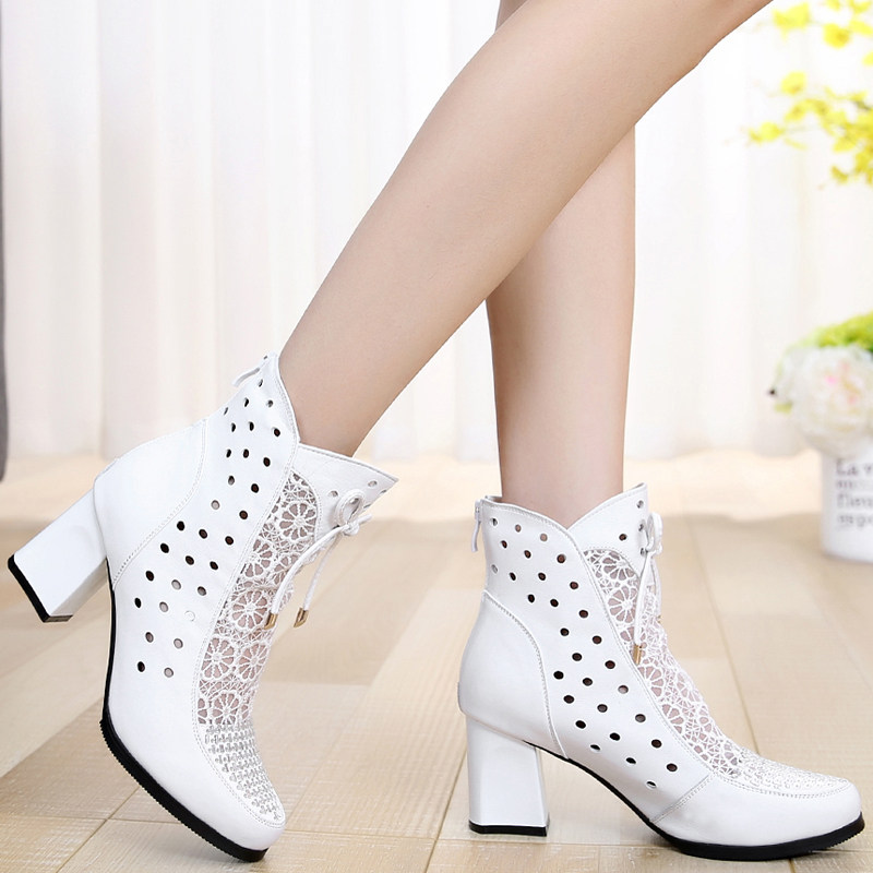 春秋新款真皮女鞋镂空女靴高跟粗跟马丁靴女短靴蕾丝网纱网靴单靴
