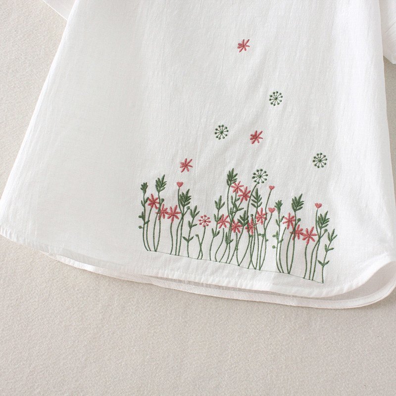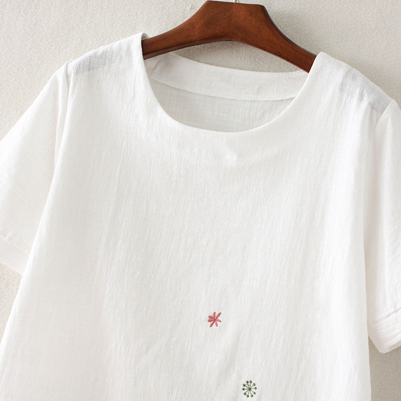 刺绣花棉麻t恤女宽松短袖上衣半袖夏装宽松亚麻夏季白色体恤大码