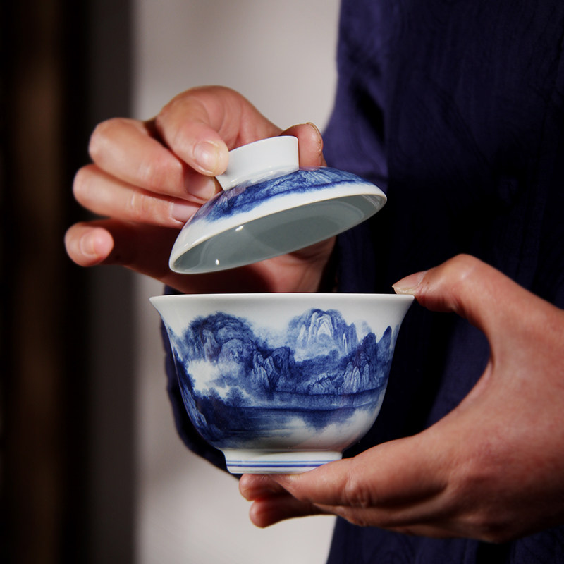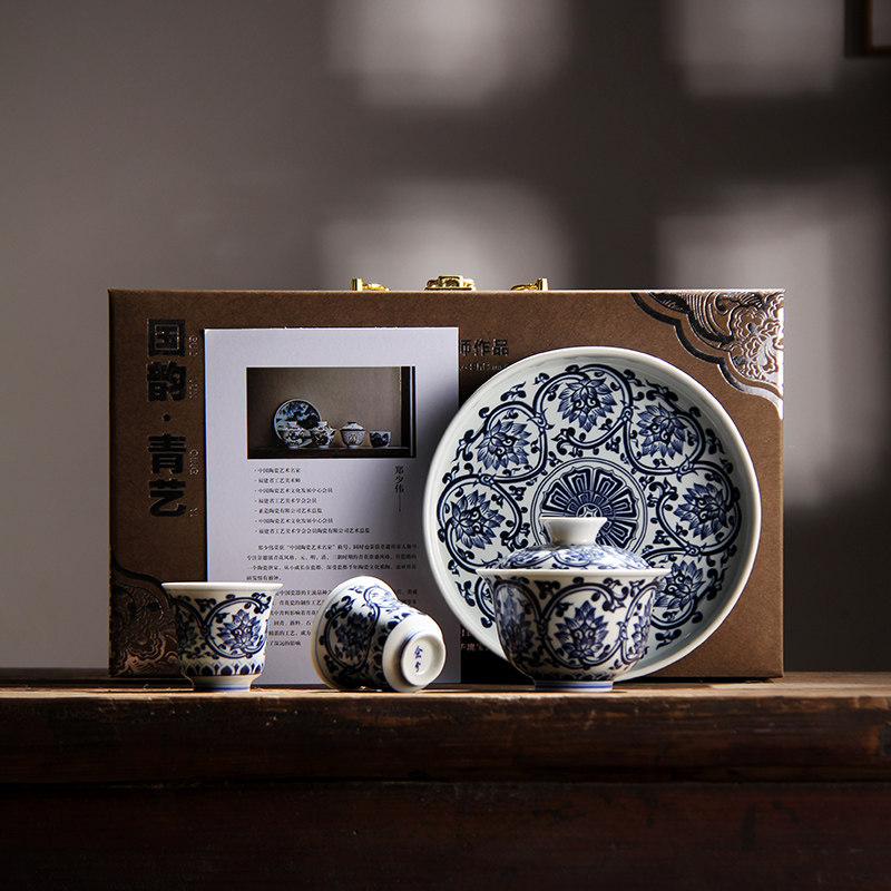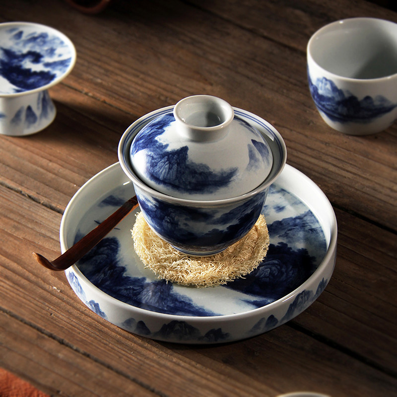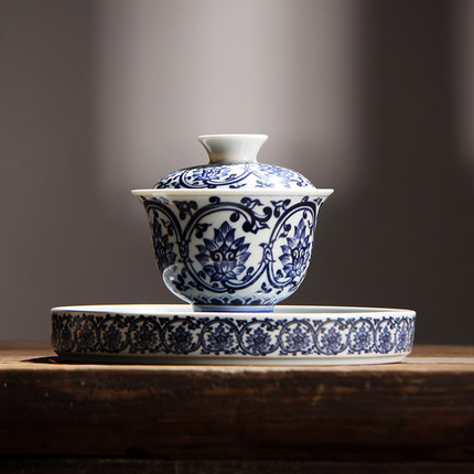 青花瓷三才盖碗景德镇蓄水壶承防烫釉下彩泡茶碗功夫茶具茶杯套装