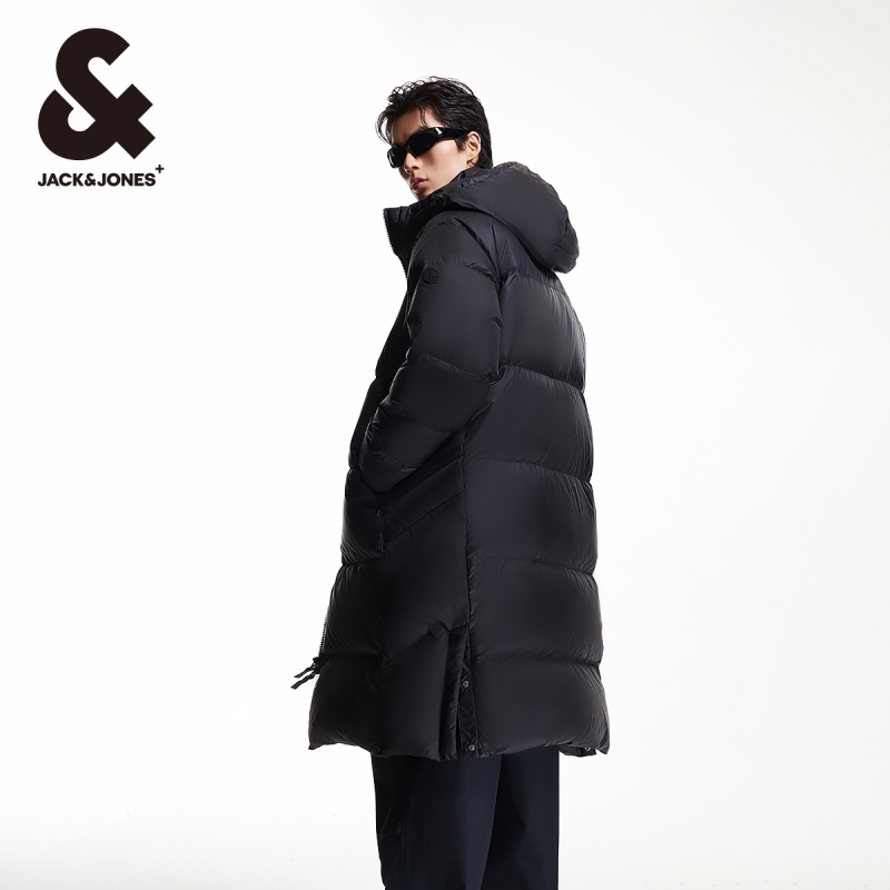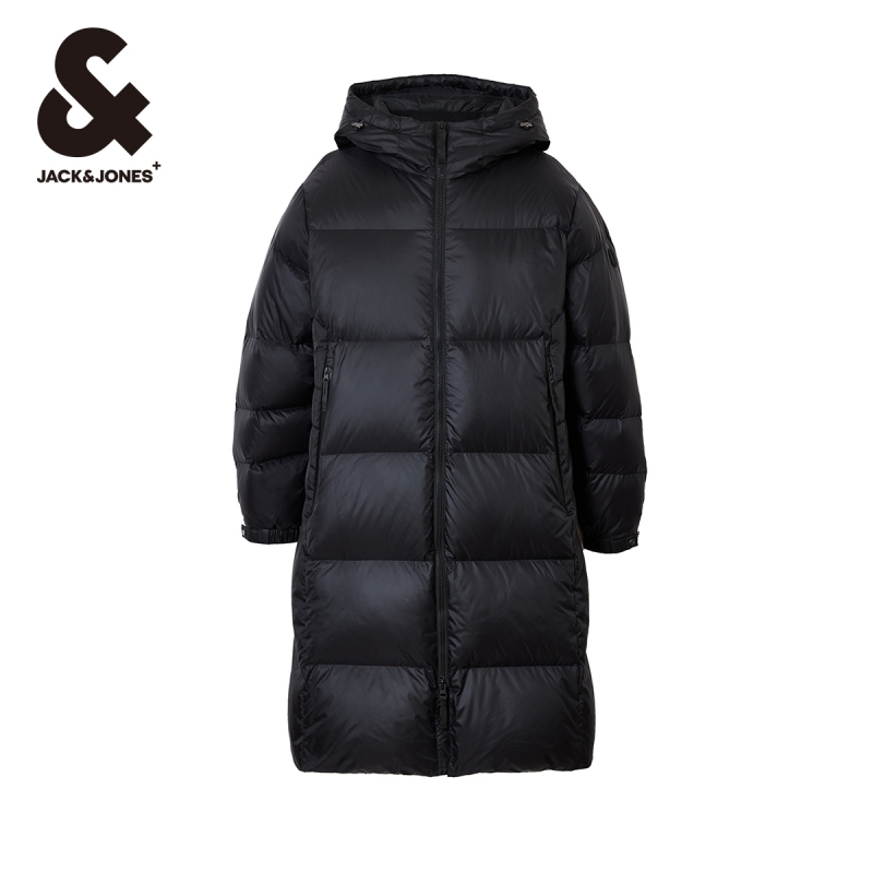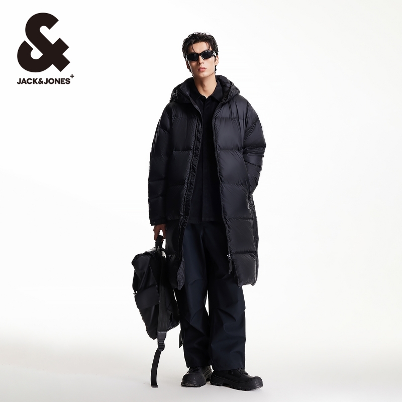 杰克琼斯outlets冬季新款灰鸭绒防泼水宽松中长款连帽羽绒服男装