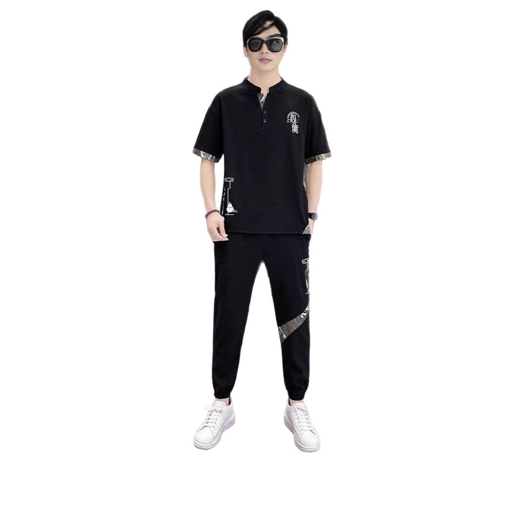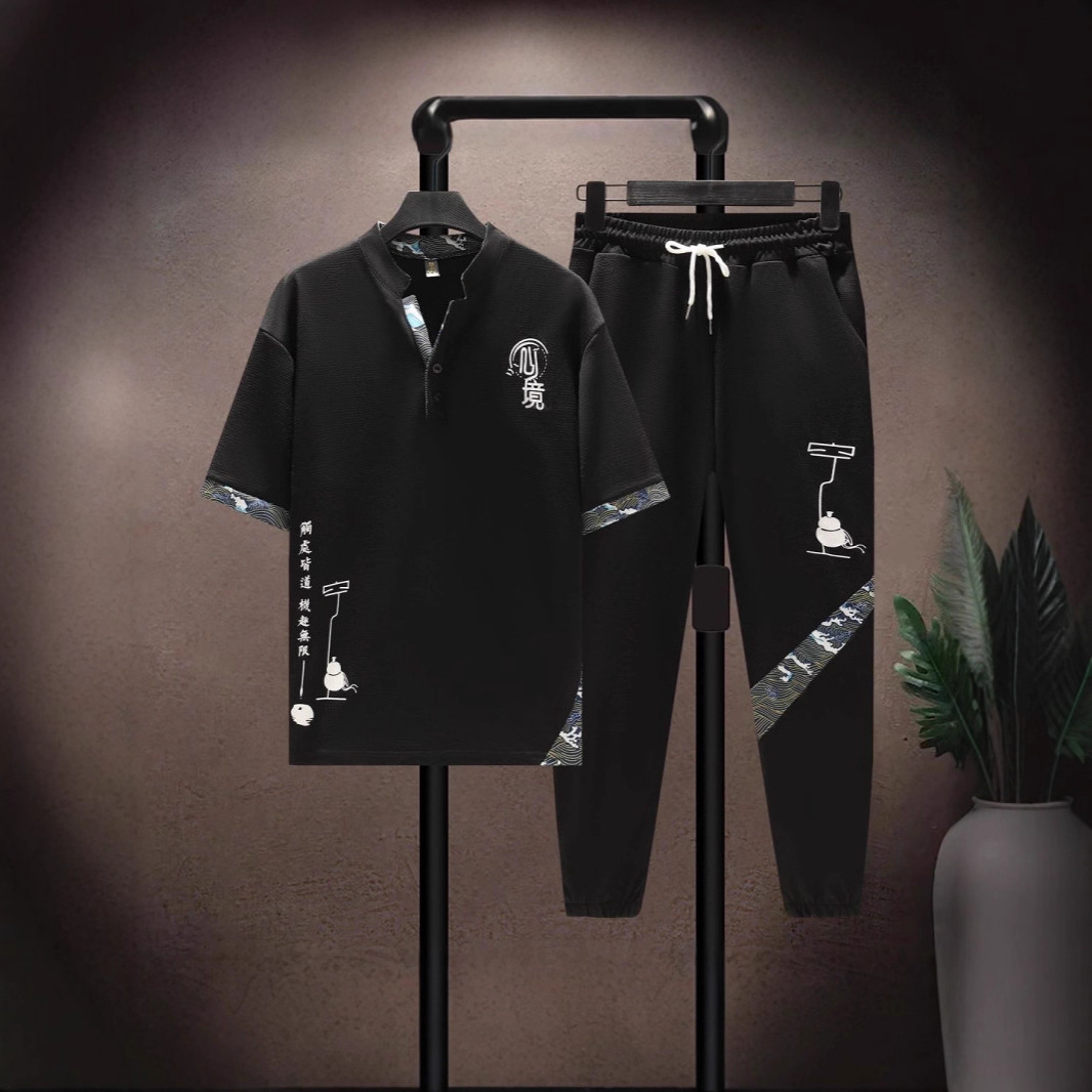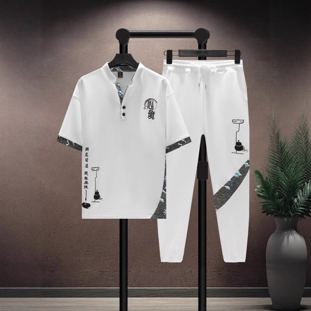 夏季中国复古风宽松短袖长裤新中式国潮运动休闲男士两件套装男士