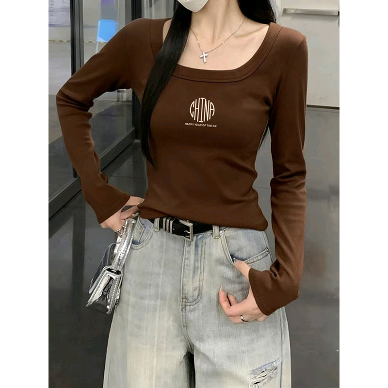 高级感咖色修身显瘦正肩T恤女春秋冬纯棉长袖打底衫方领短款上衣