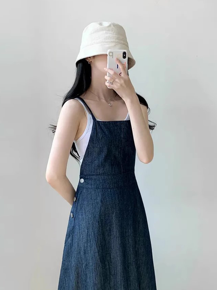 韩国chic夏季复古小众翻领侧边单排扣收腰显瘦牛仔吊带裙连衣裙女