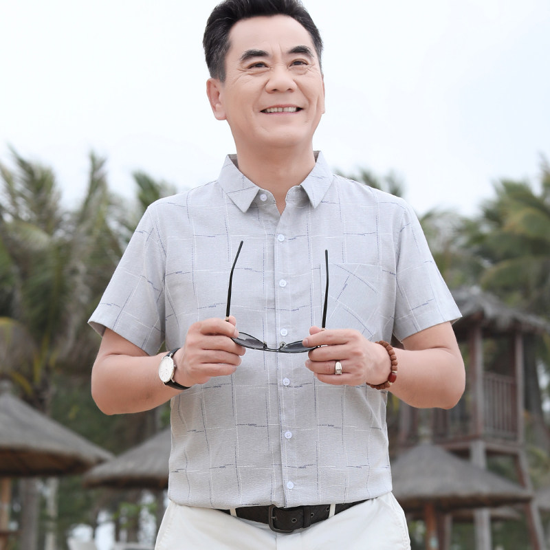 爸爸夏装衬衫短袖格纹字母印花中老年人男士上衣夏款宽松透气衬衣