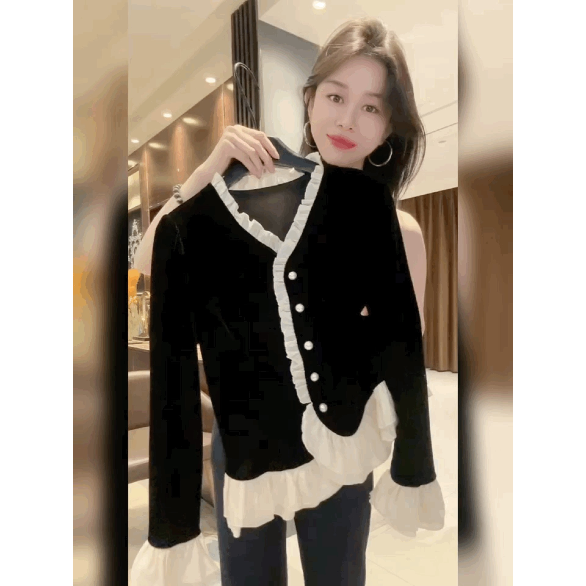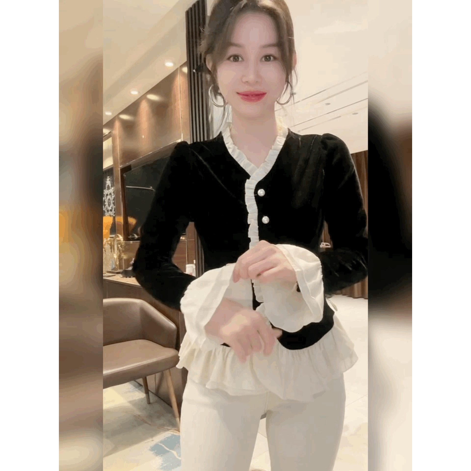 法式黑色荷叶边长袖衬衫女雪纺拼接丝绒T恤喇叭袖黑色小香风上衣