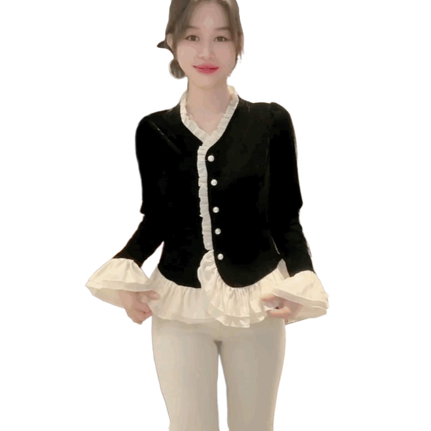 法式黑色丝绒荷叶边拼接长袖衬衫