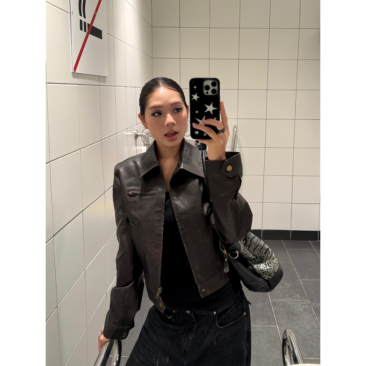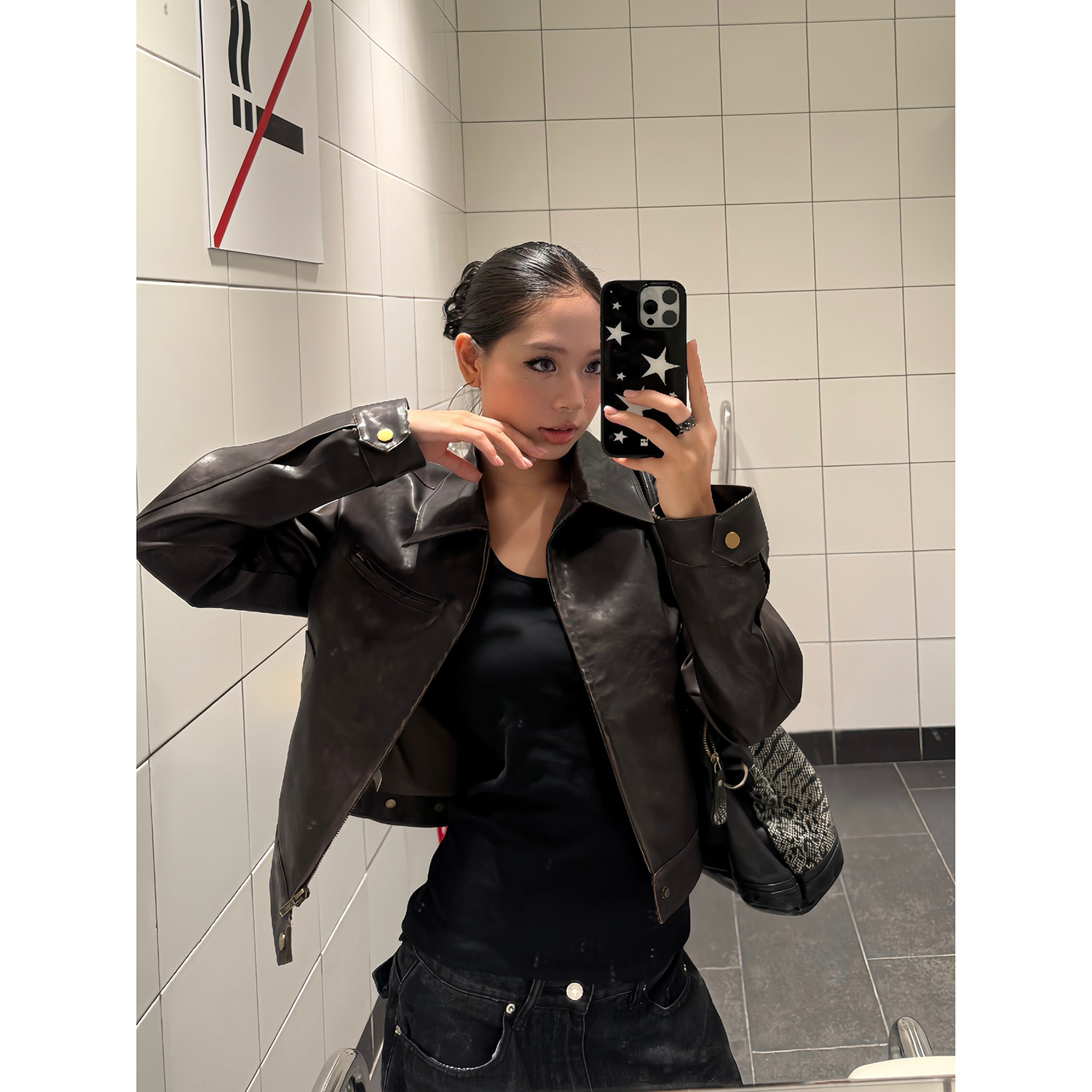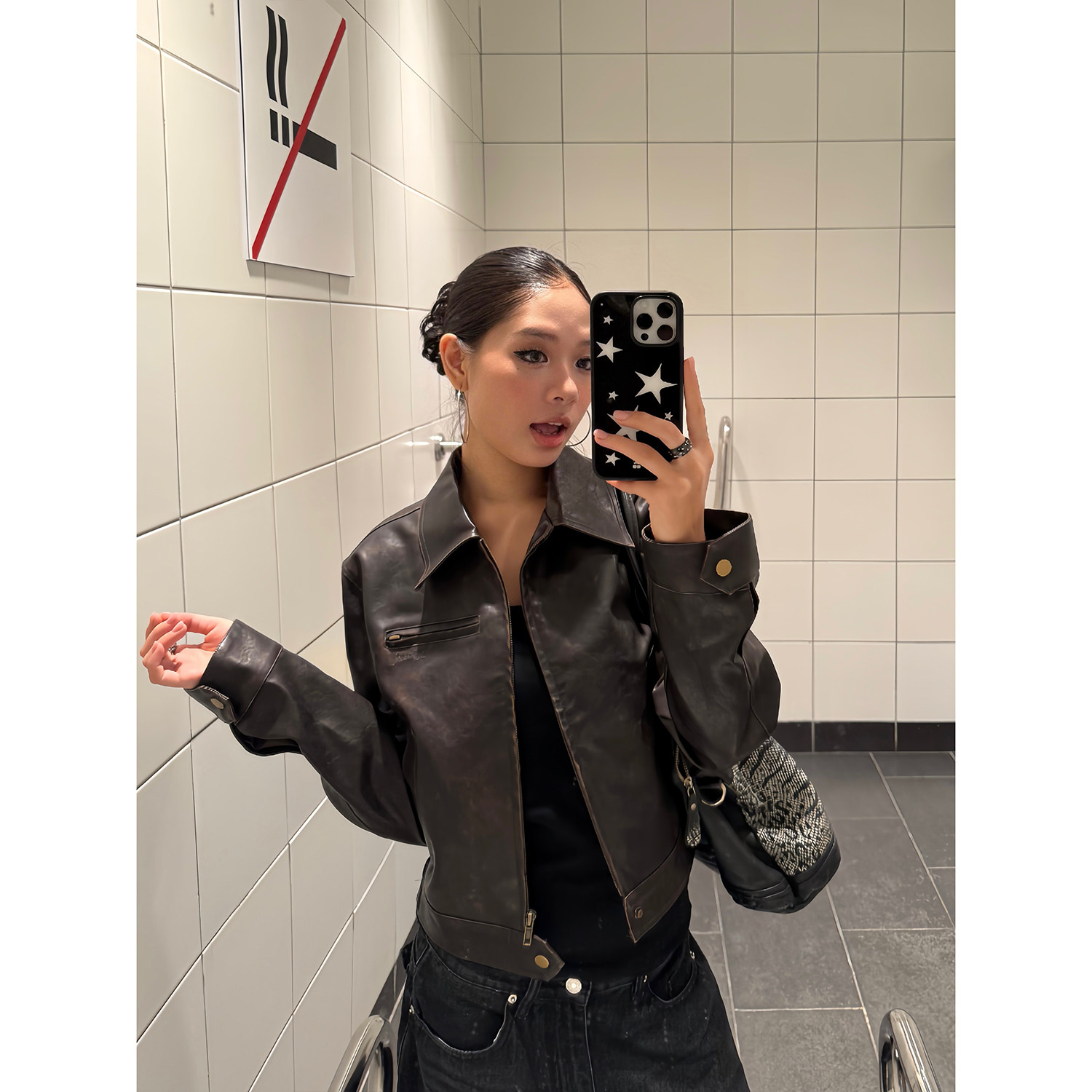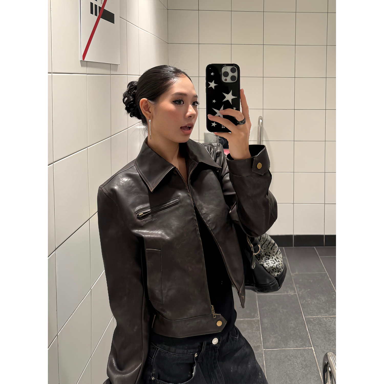 F383美式复古短款翻领皮衣外套女早秋修身PU复古机车夹克上衣ins