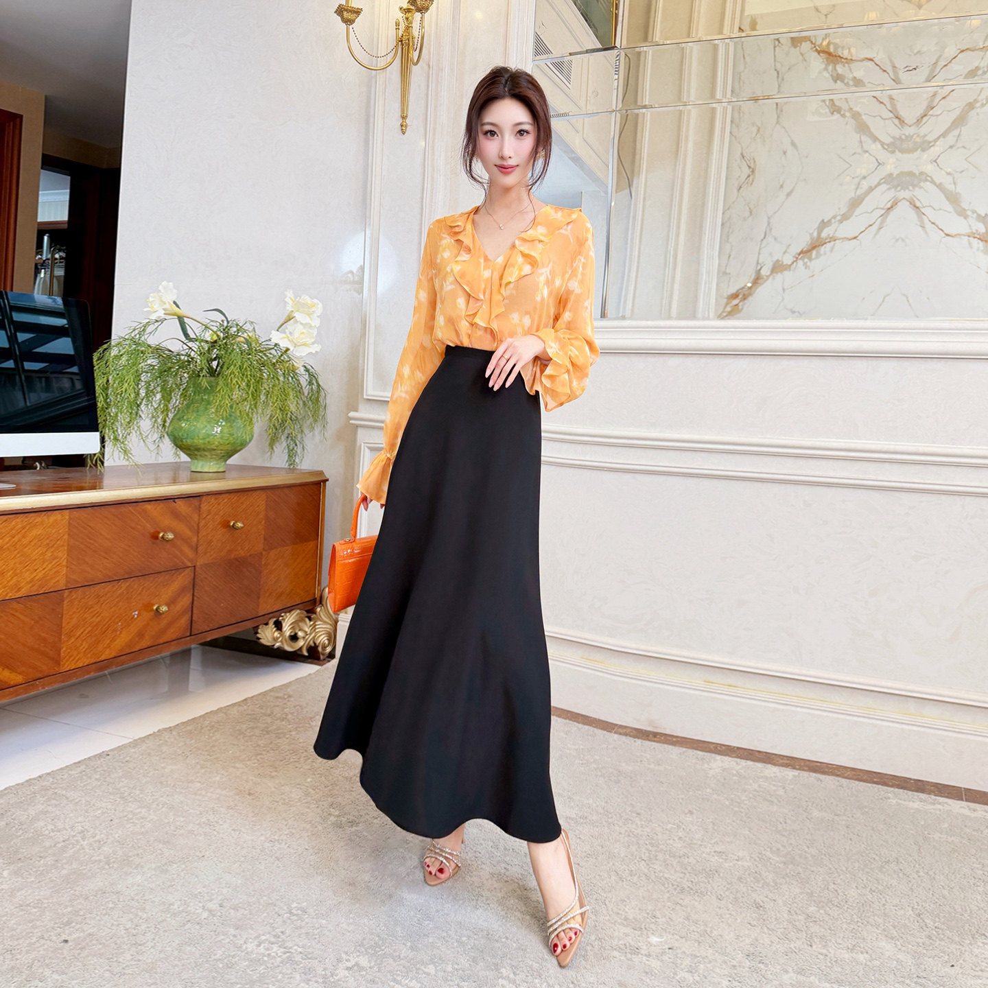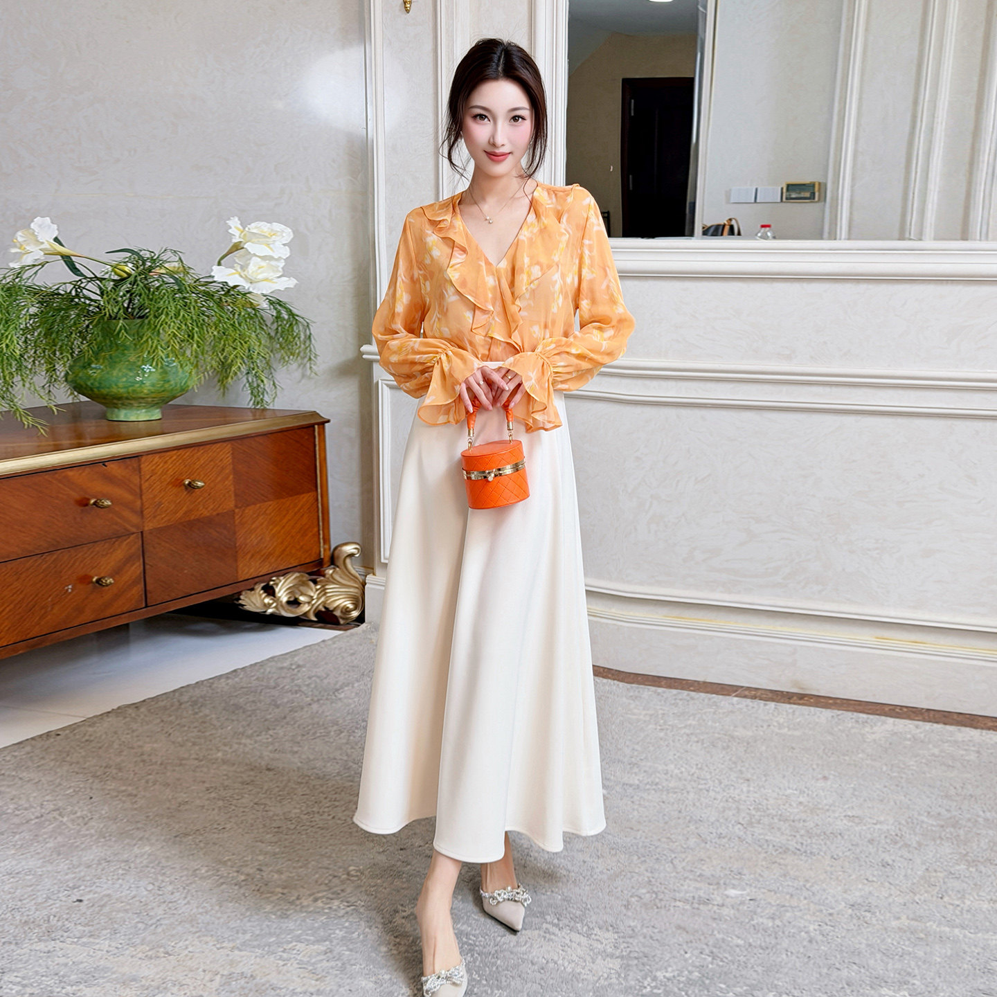 飞姐定制2026春款韩版印花荷叶边V领雪纺衫女人味喇叭袖衬衫上衣
