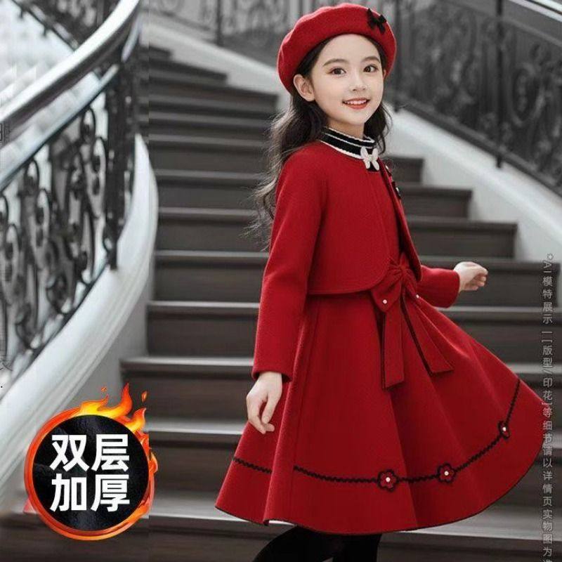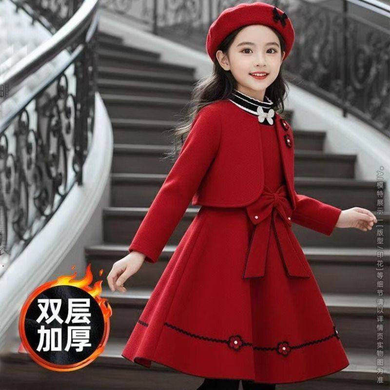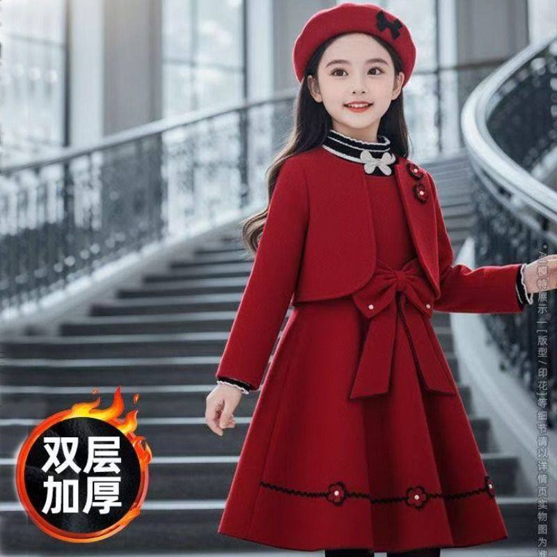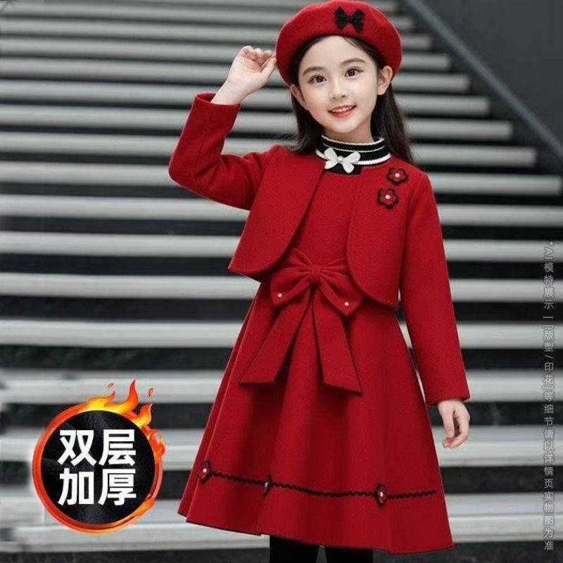 2026新女童秋冬套装裙子中大童呢子礼服儿童连衣裙过年服红色裙子
