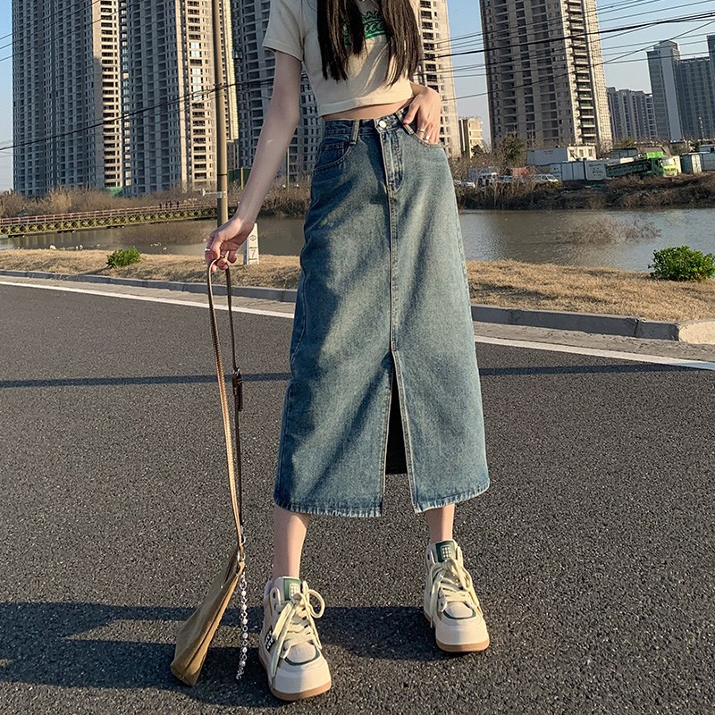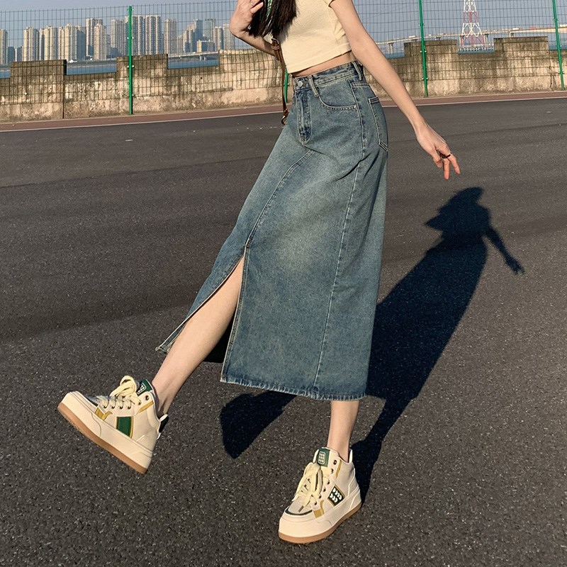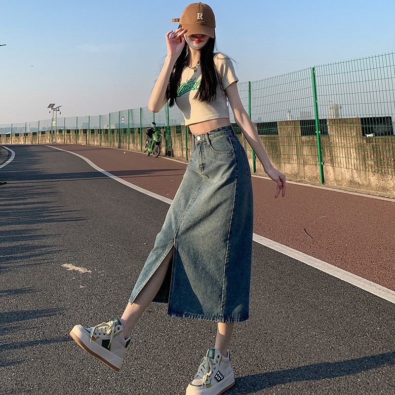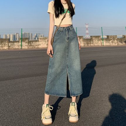 小个子150cm设计感开叉高腰牛仔半身裙女2024新款显瘦a字包臀裙子