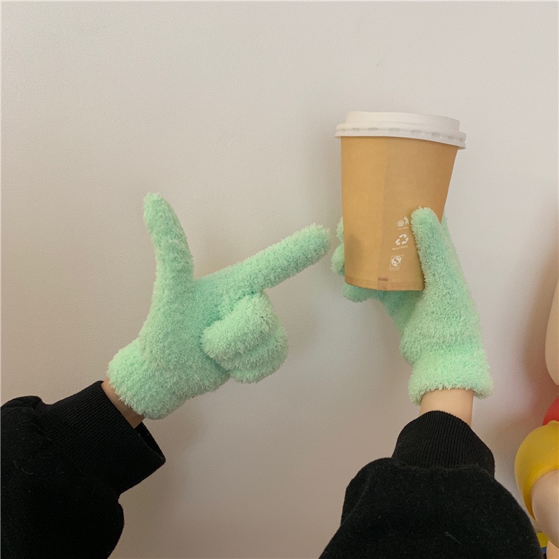 出品韩国可爱珊瑚绒手套女秋冬季加厚骑车保暖毛绒糖果色防寒男