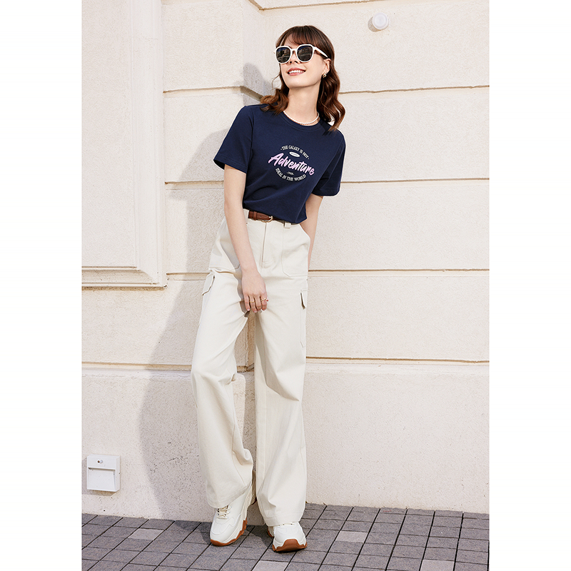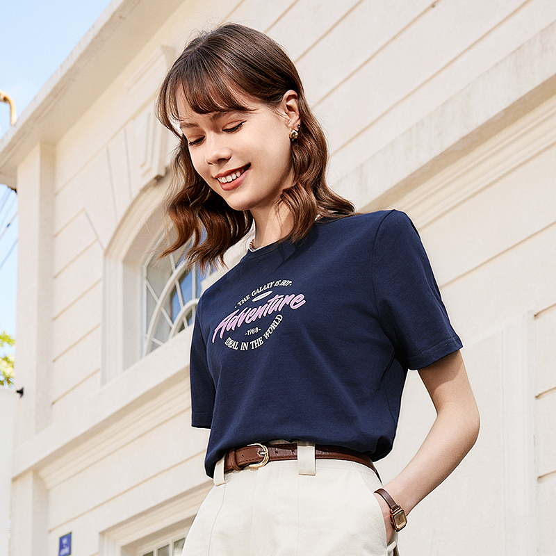 betu百图女装2024年夏季新款复古字母印花短袖纯棉休闲T恤上衣