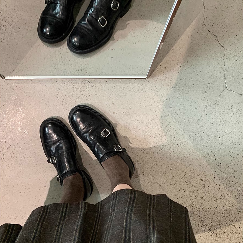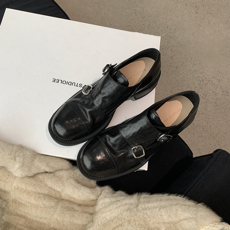 缩纹马皮双扣小皮鞋女2024春季新款英伦雕花圆头粗跟百搭乐福单鞋