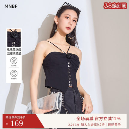 【商场同款】曼诺比菲夏季黑色玫瑰花朵褶皱抹胸吊带衫