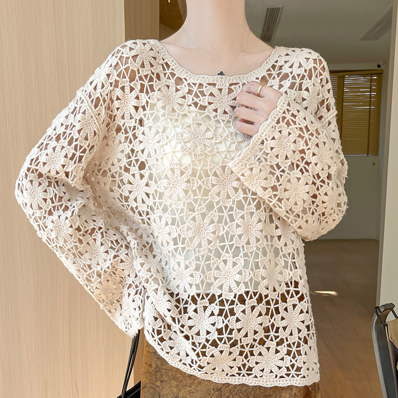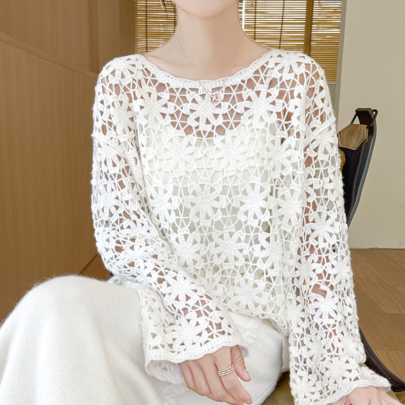 重工镂空钩花100%纯羊毛衫毛衣女秋冬微透宽松慵懒羊绒衫针织打底