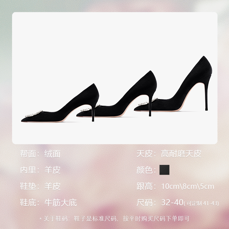 hltino2025夏季新款黑色法式水钻尖头高跟鞋女细跟不累脚大码单鞋