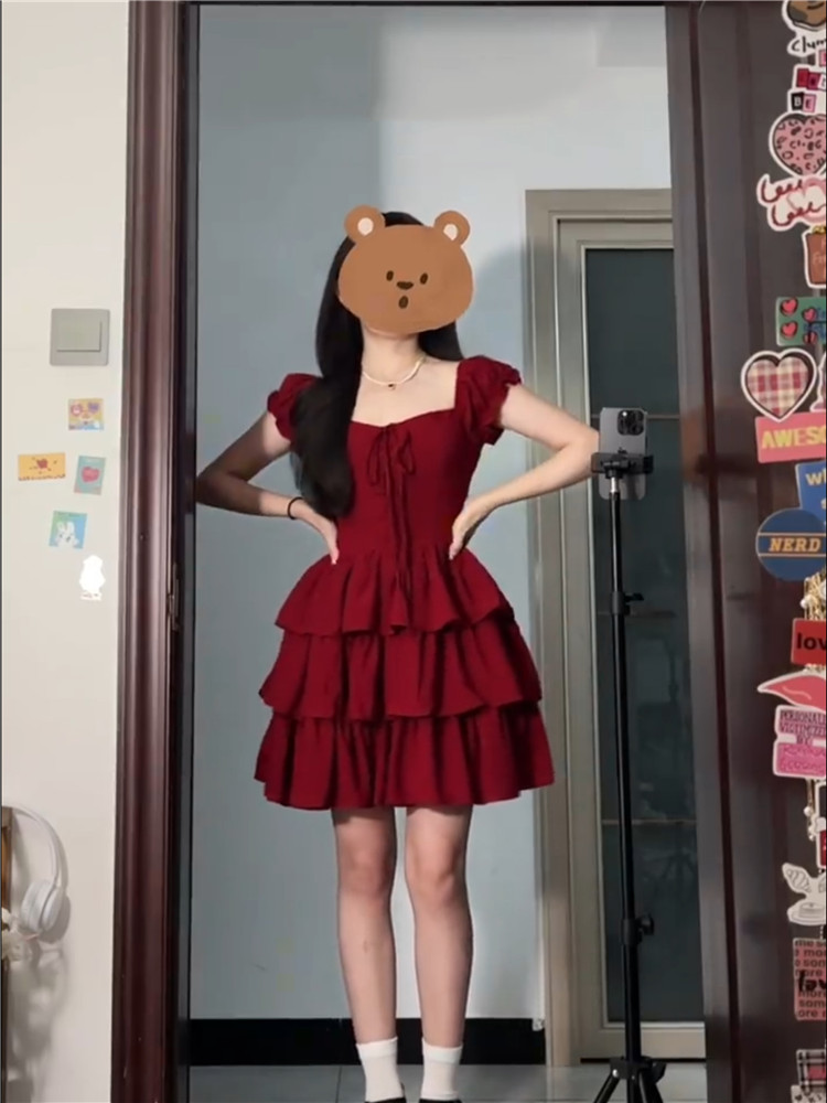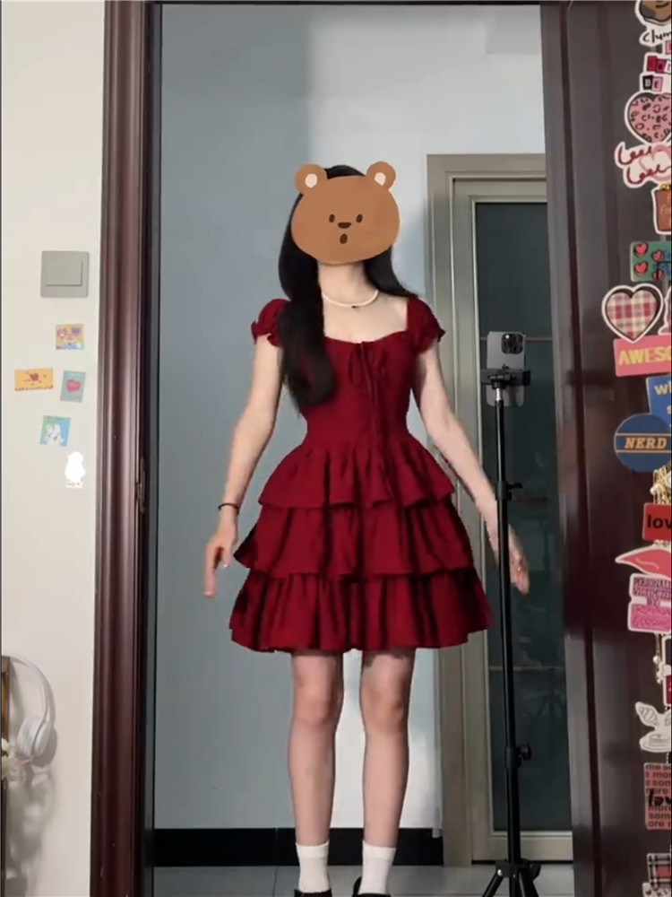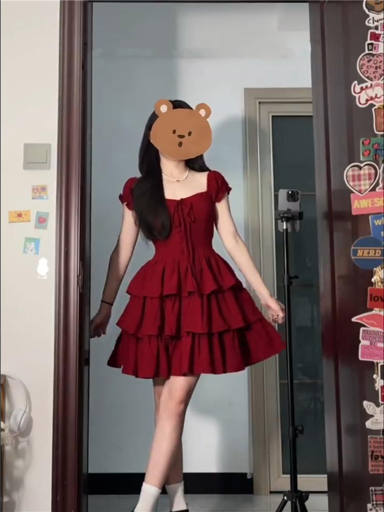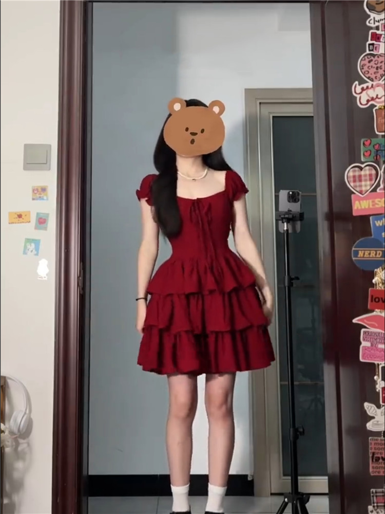 复古宫廷风方领泡泡袖红色氛围感蛋糕裙女夏季新款显瘦气质连衣裙