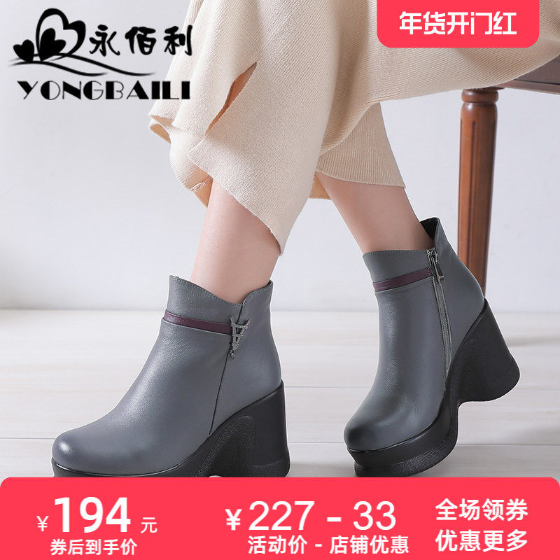 松糕厚底休闲风坡跟圆头皮鞋女靴