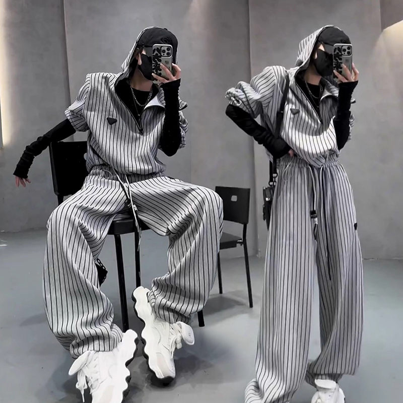 欧洲站25春秋新款显瘦条纹休闲运动服套装女连帽卫衣阔腿裤两件套