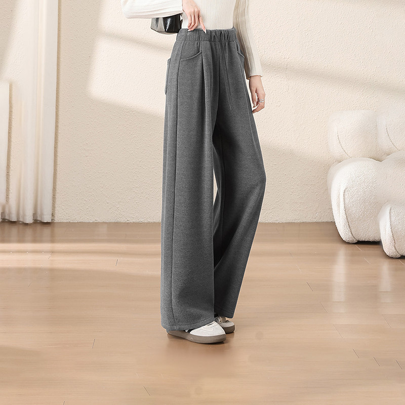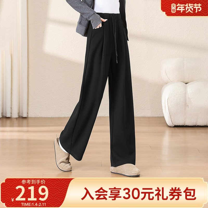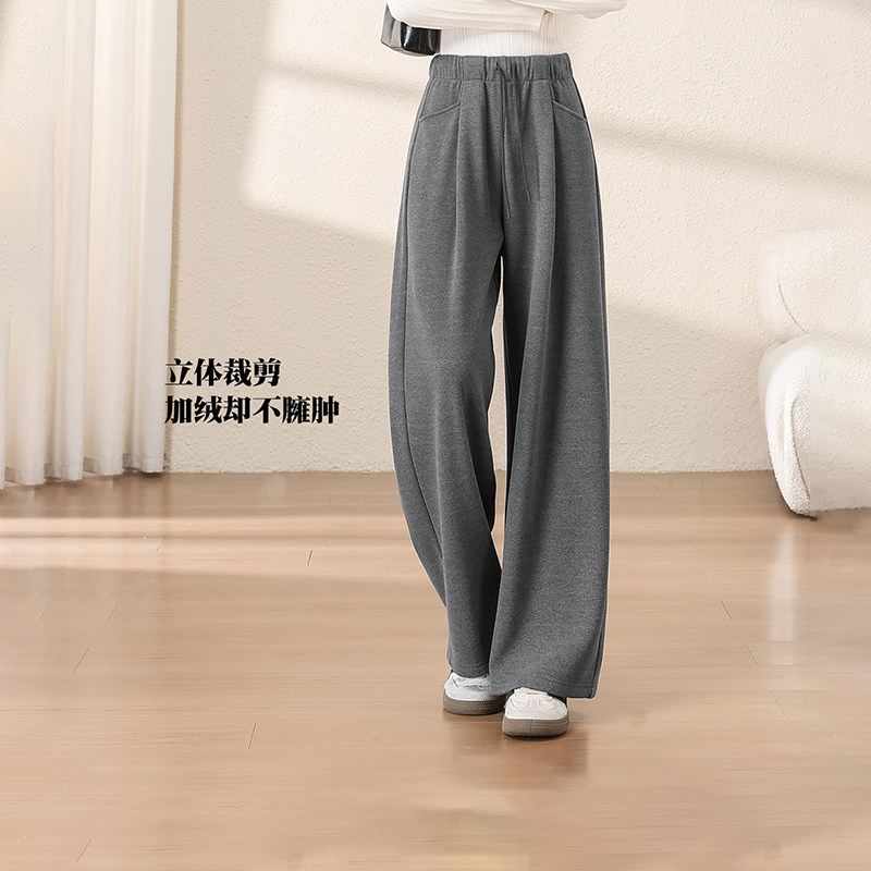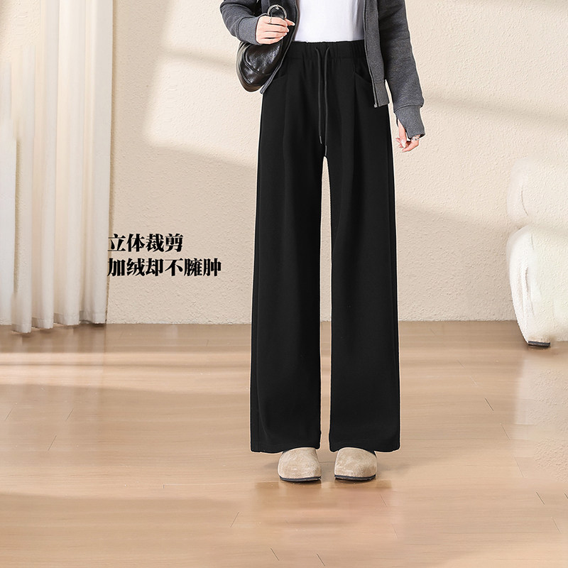 热风女士时尚加绒休闲长裤冬季百搭保暖宽松阔腿直筒裤气质垂感
