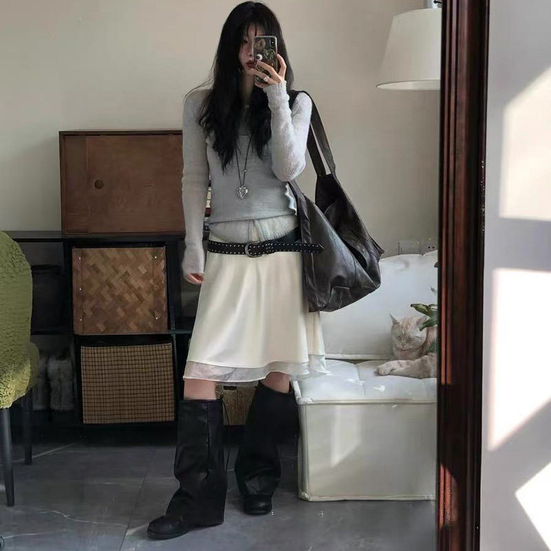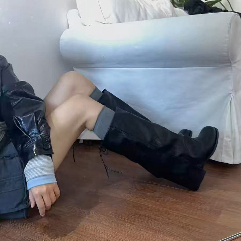 夏季靴子女薄款配裙子显瘦长筒靴复古堆堆靴2025年新款粗跟裤管靴