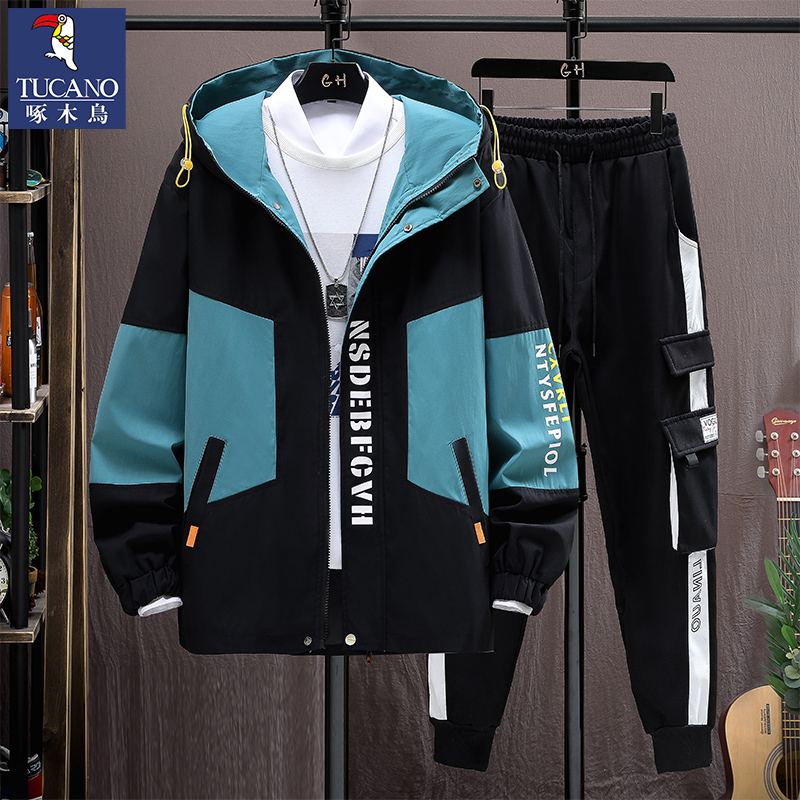 啄木鸟高档外套男春秋季2025新款夹克休闲宽松套装青少年潮两件套