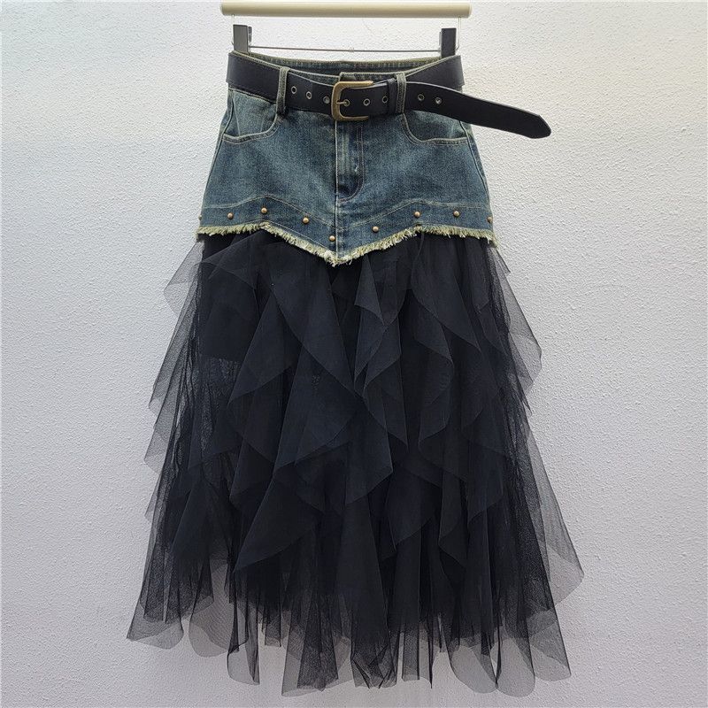 网纱拼接中长款牛仔半身裙女2025春夏新款时尚百搭高腰显瘦包臀裙