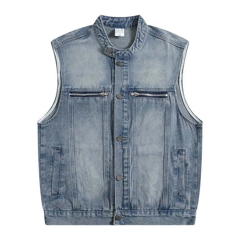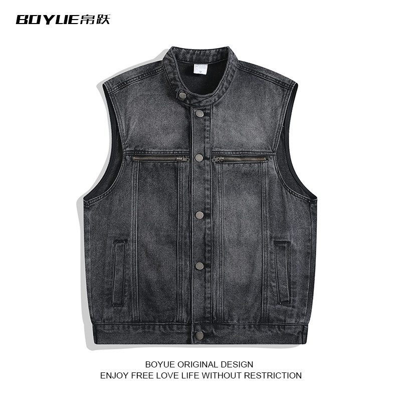 BOYUE帛跃港风ins做旧水洗牛仔马甲拉链休闲立领坎肩背心男女外套