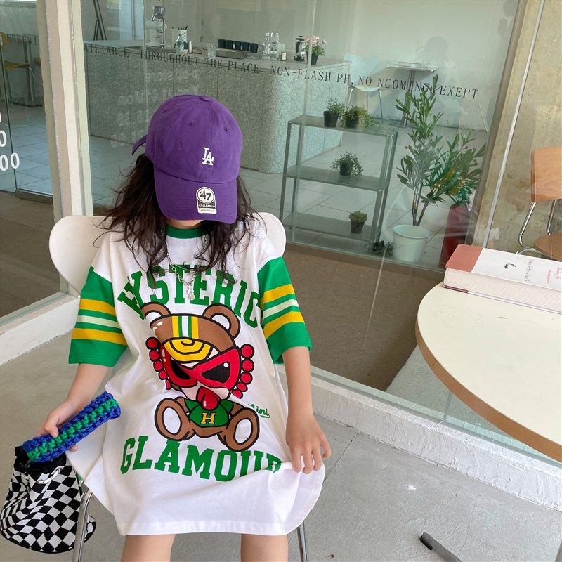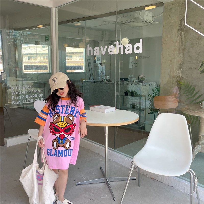 2023夏季新款女童纯棉T恤裙亲子装母女装卡通印花中长宽松连衣裙