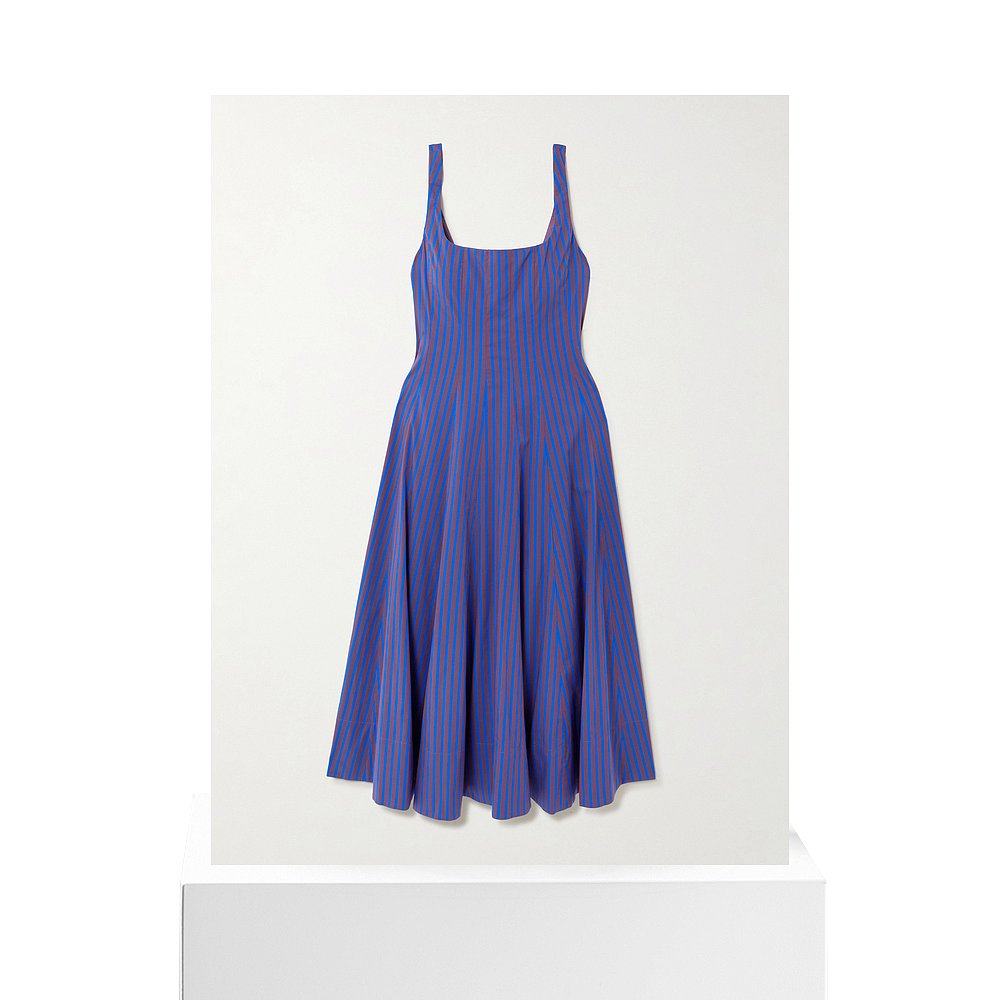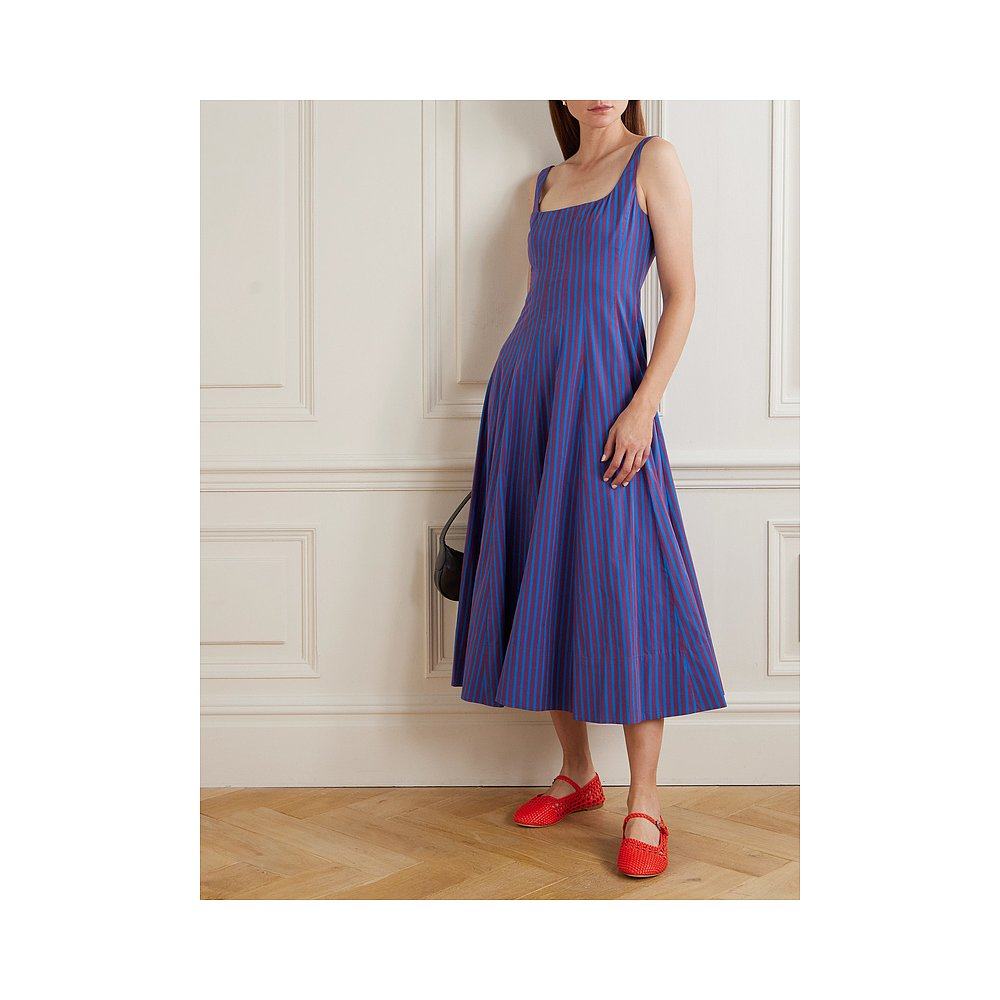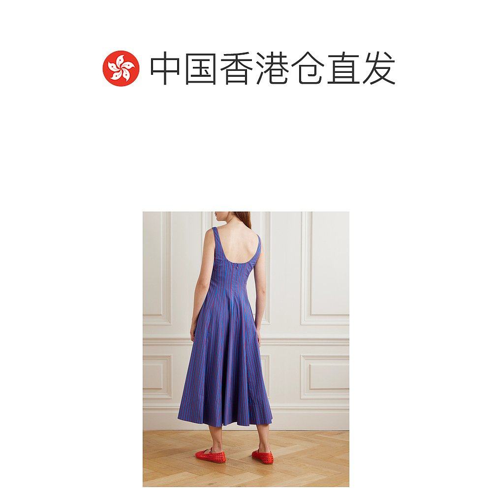 1h可退 Staud 女士 Wells 褶裥条纹棉混纺府绸中长连衣裙背带裙