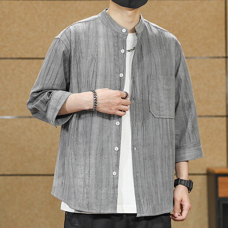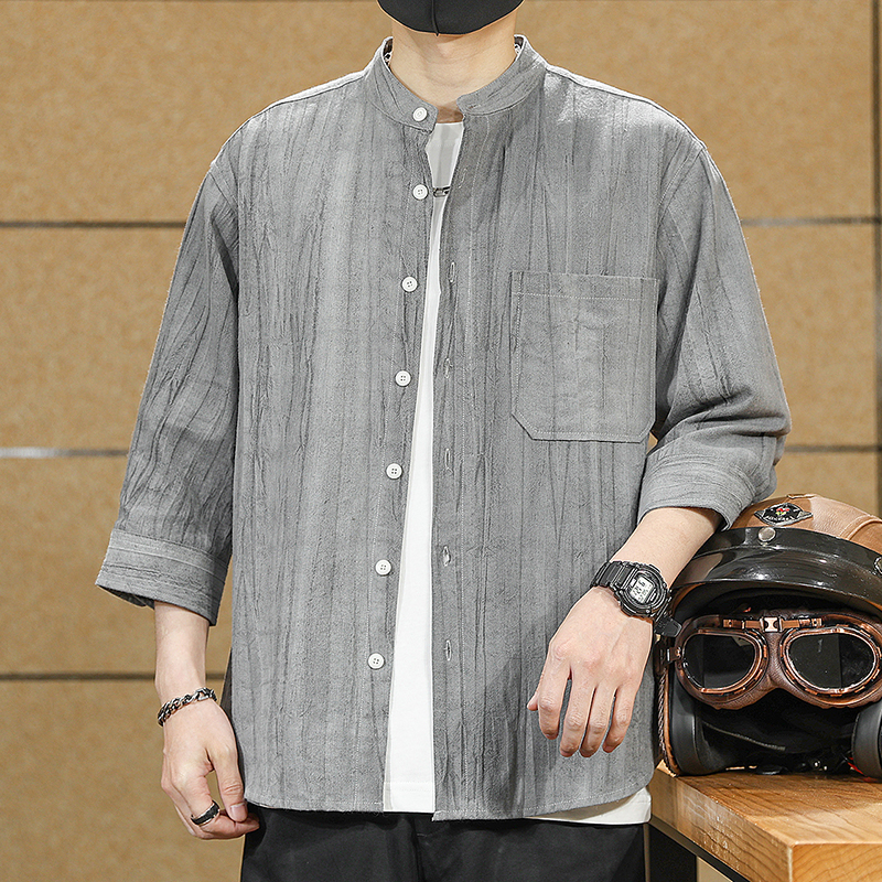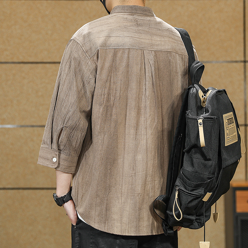 高端棉麻七分袖衬衫男2025新款短袖男士夏季薄款复古立领潮牌衬衣