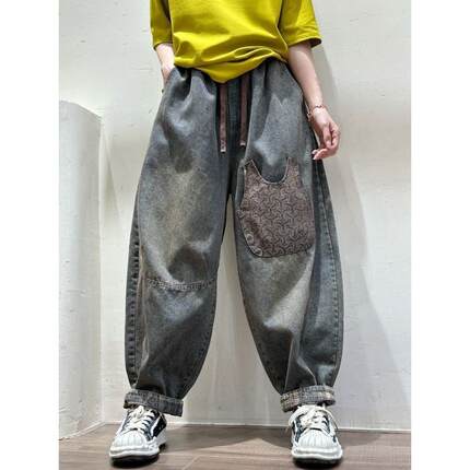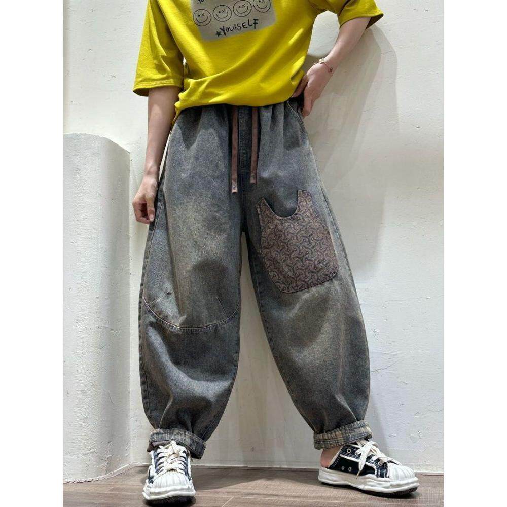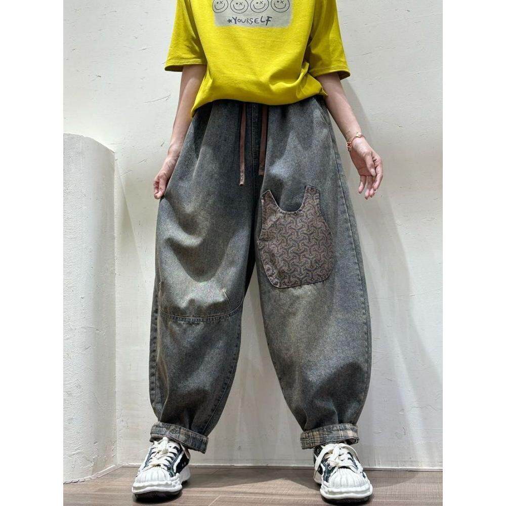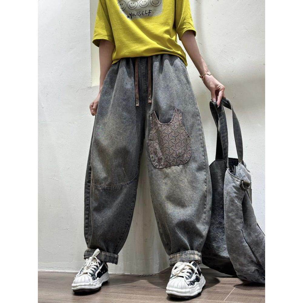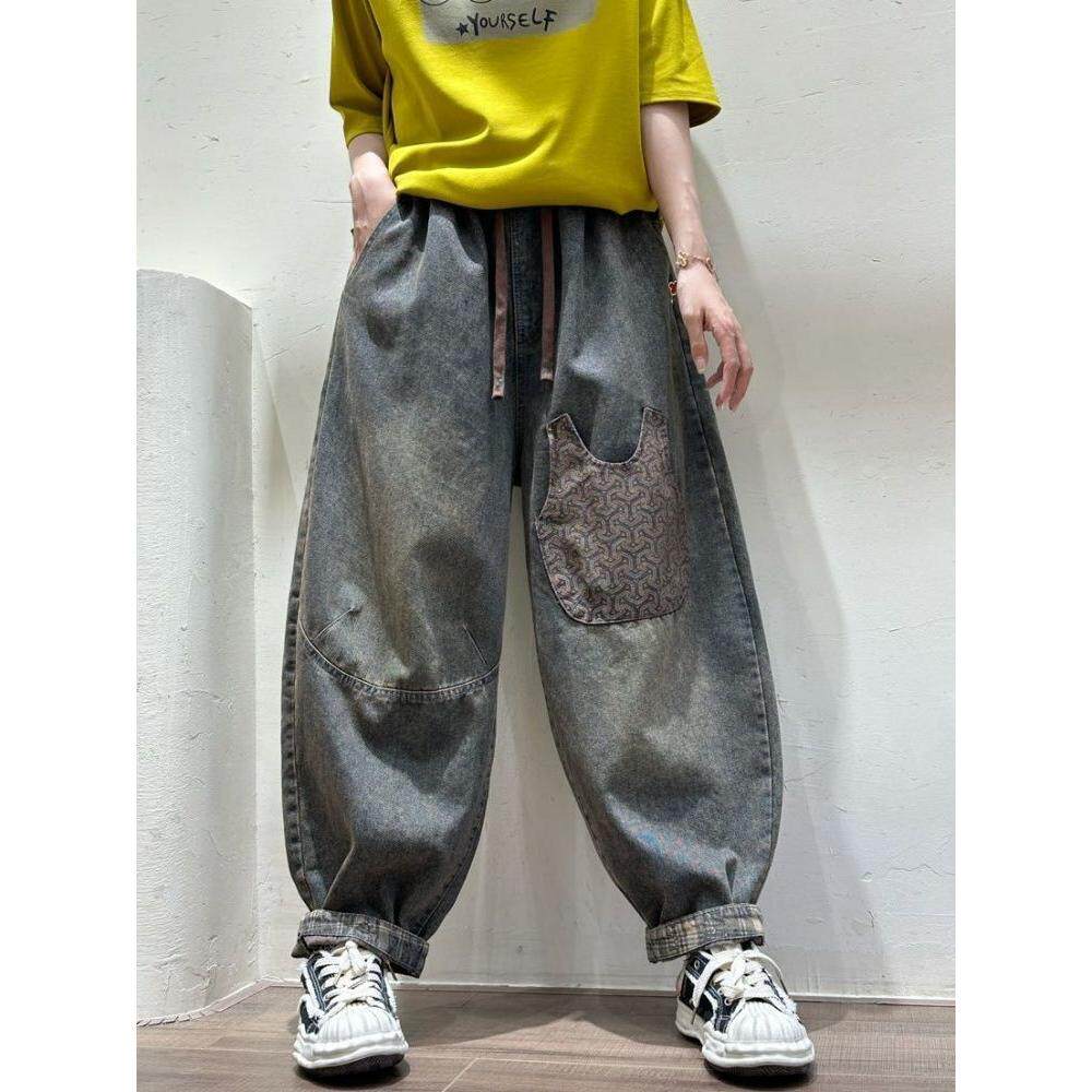 2025秋季新款复古做旧大口袋抽绳宽松大码牛仔裤女时尚显瘦哈伦裤