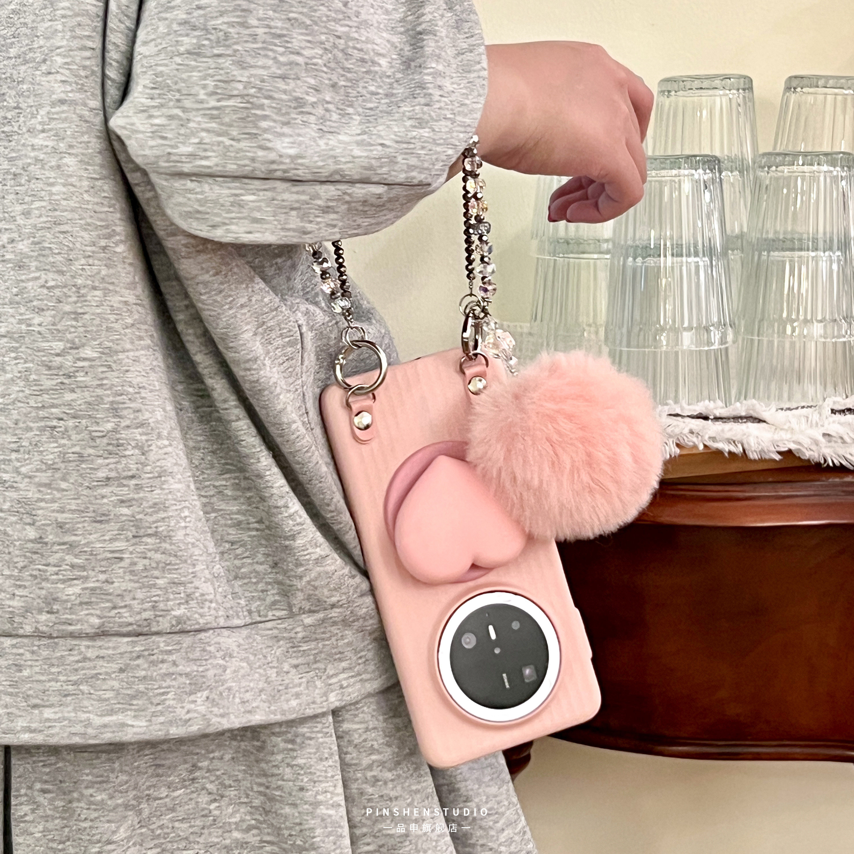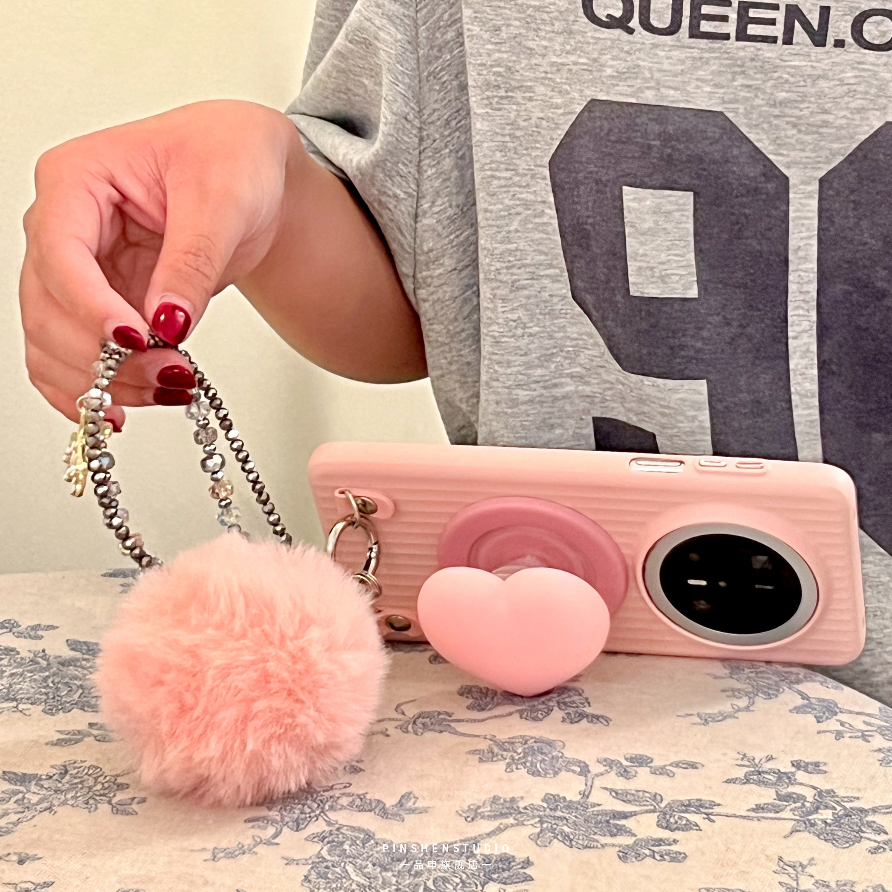品申原创pc轻薄少女粉甜美爱心磁吸支架毛球手提链条适用华为mate80pro手机壳全包防摔高级感ins苹果17保护套