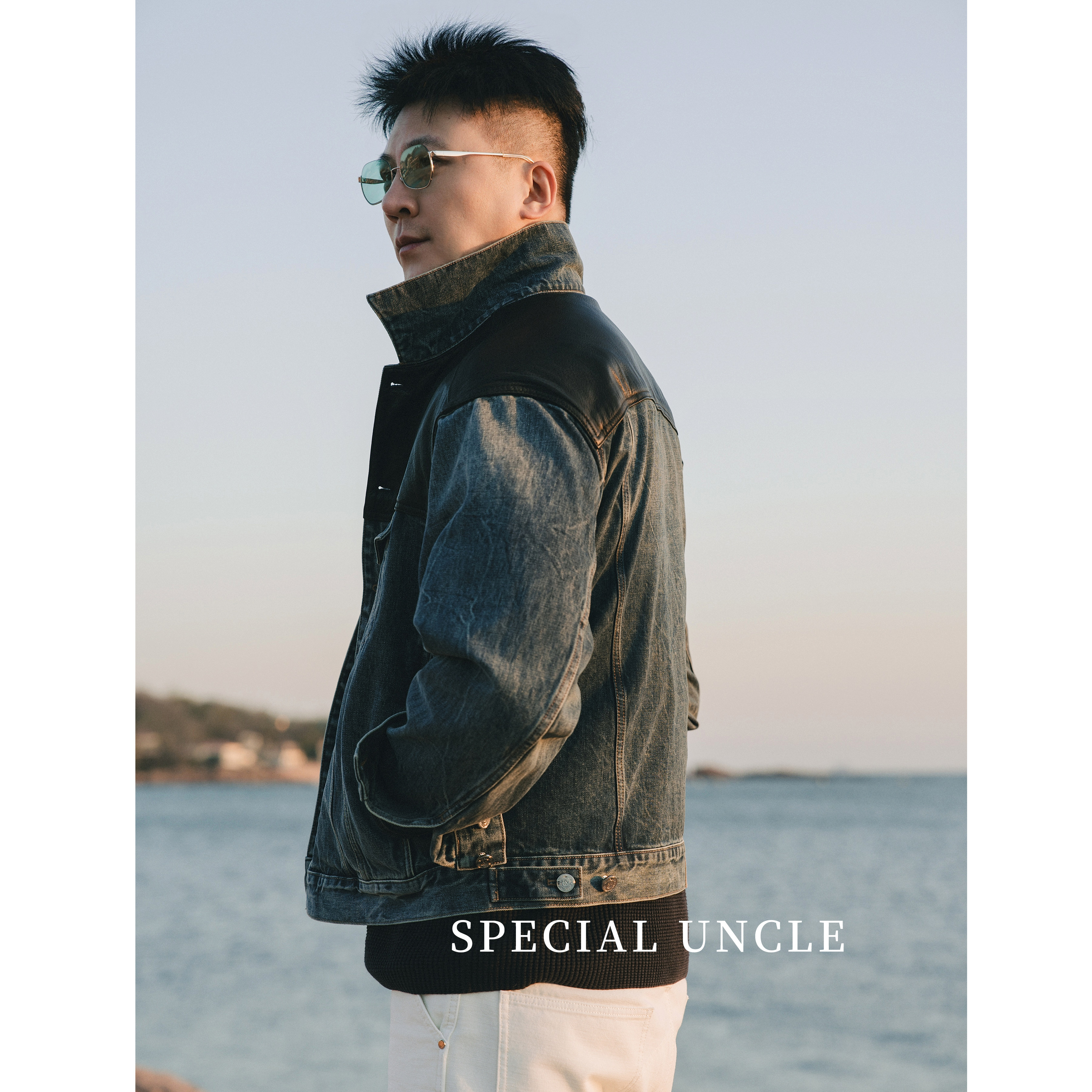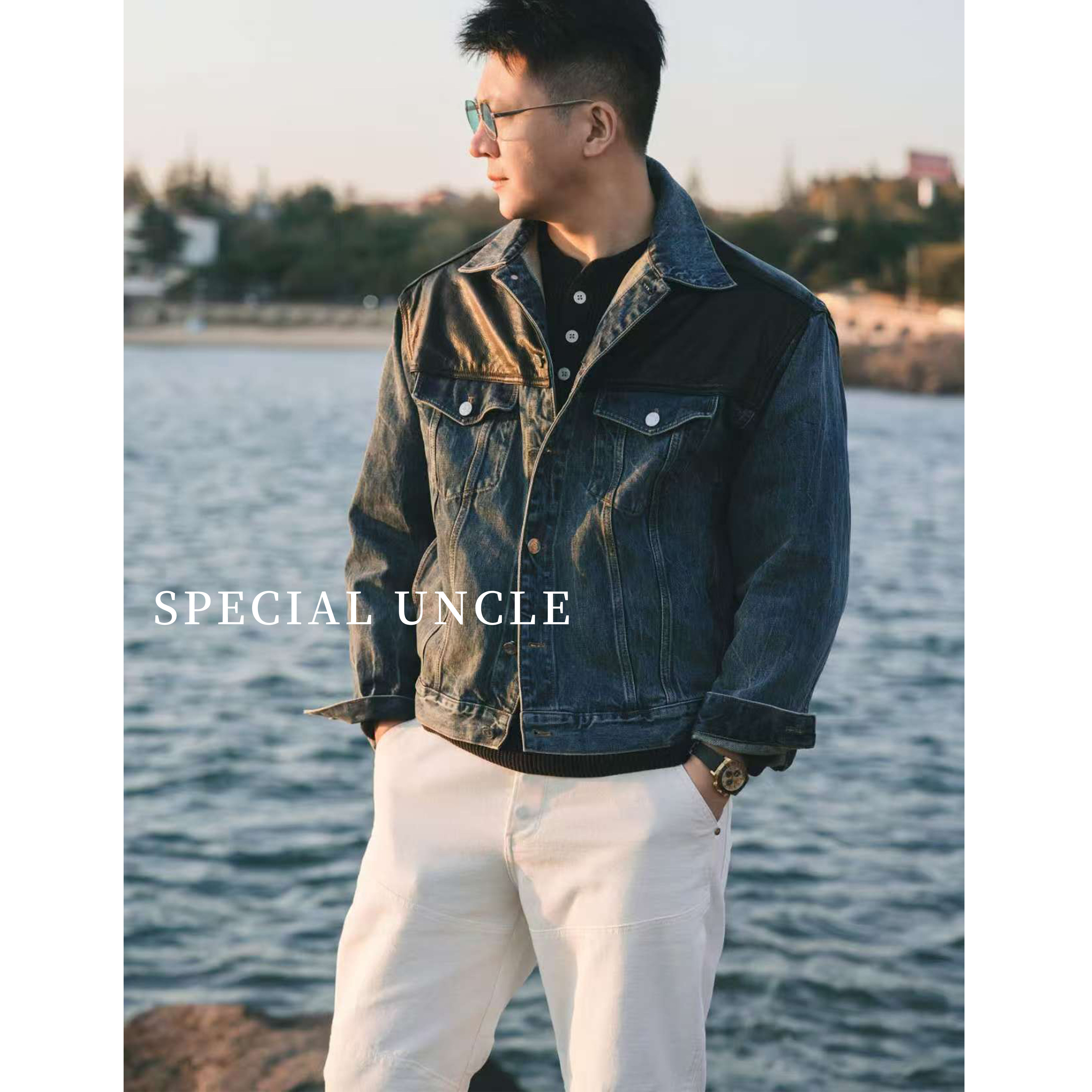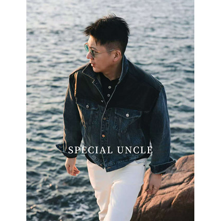 特叔时尚深蓝拼皮排扣复古衬衫牛仔夹克春秋外套休闲宽松短款美式