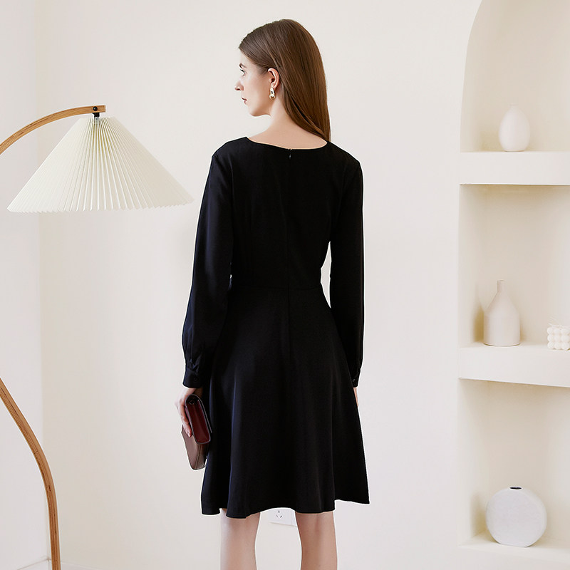映想秋冬季V领黑色女连衣裙长袖修身小黑裙