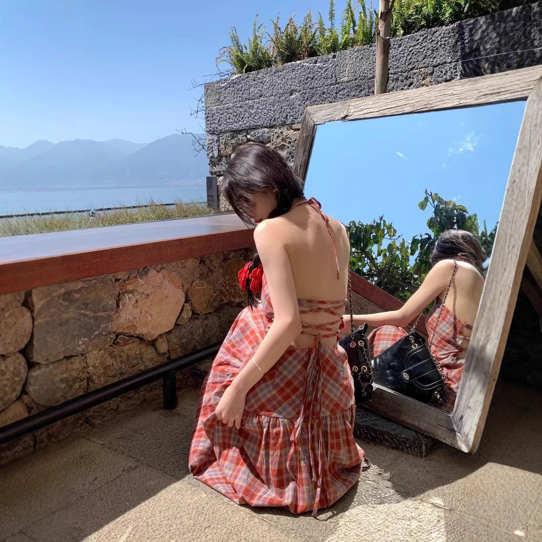 2025新款度假连衣裙夏季法式多巴胺甜美格纹露背挂脖系带连衣裙女