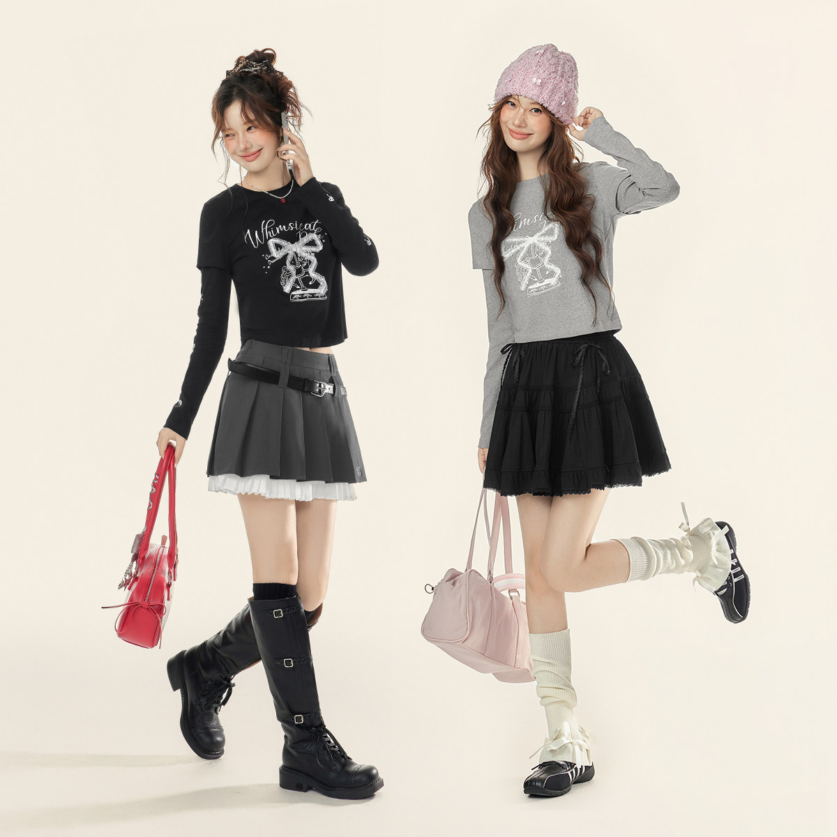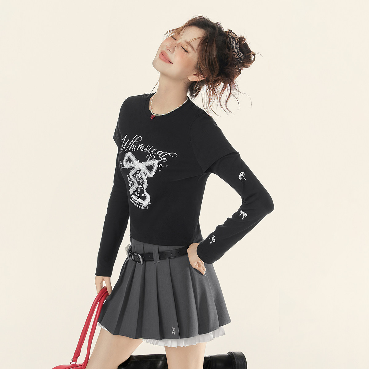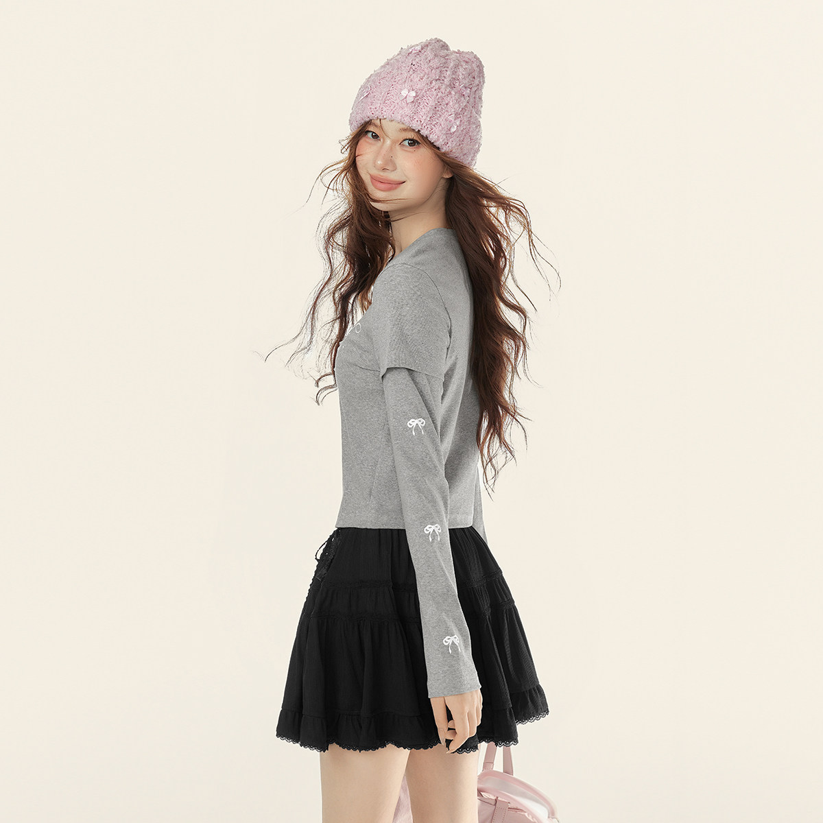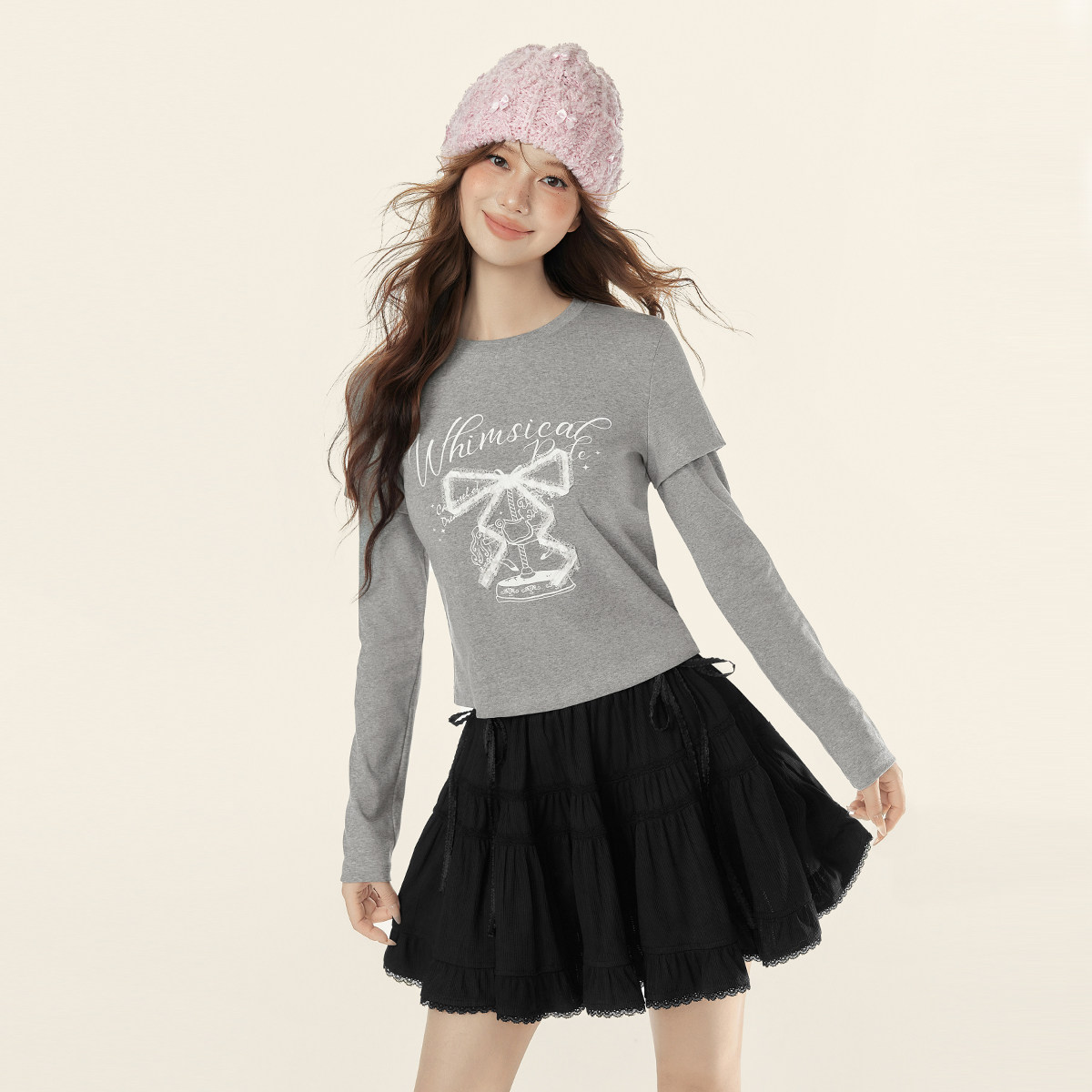 EPTISON长袖T恤女2025冬季新款美式甜辣假两件蝴蝶结修身短款上衣