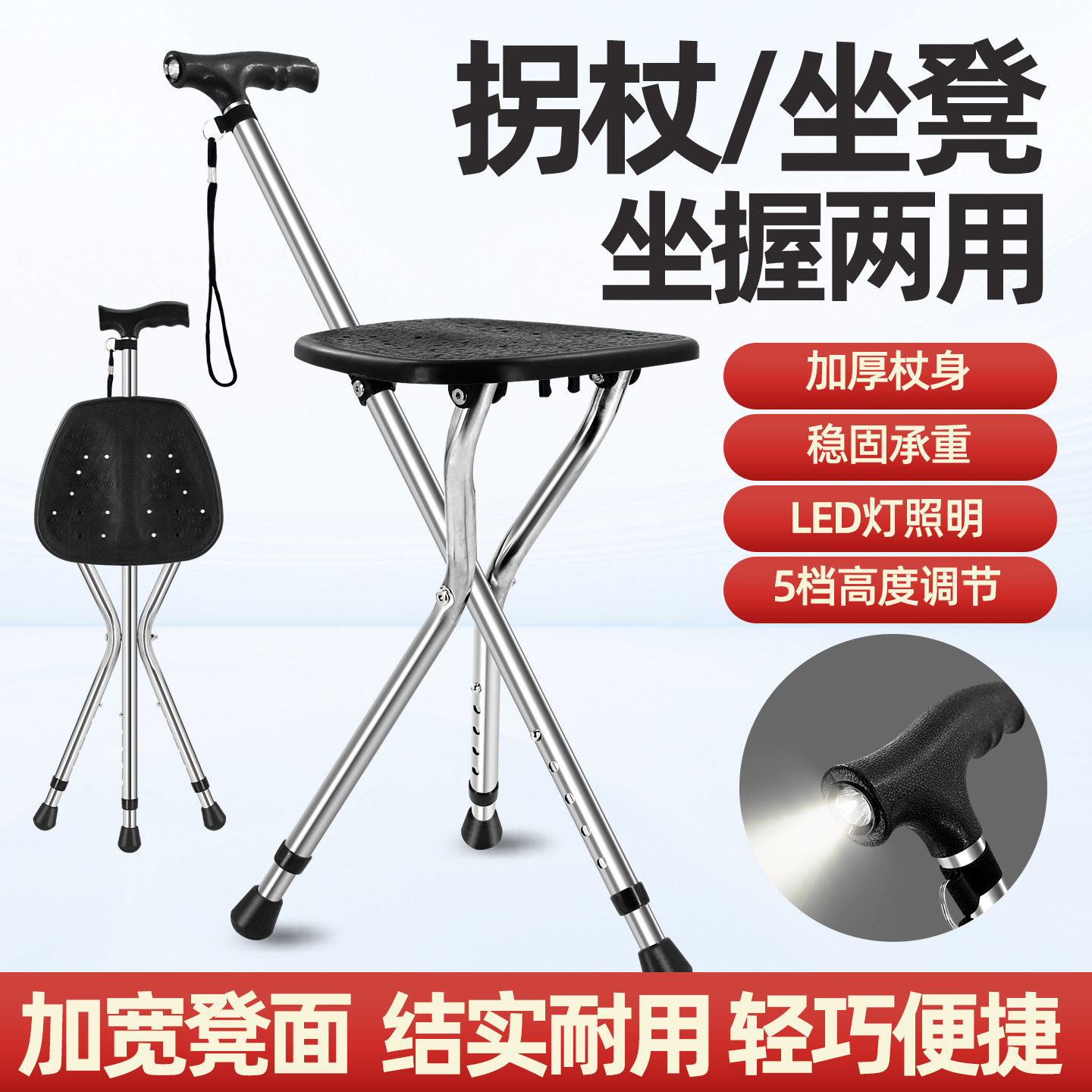 老人不锈钢拐杖凳防滑手杖凳拐棍椅子可调三脚手杖凳子可坐手杖拐