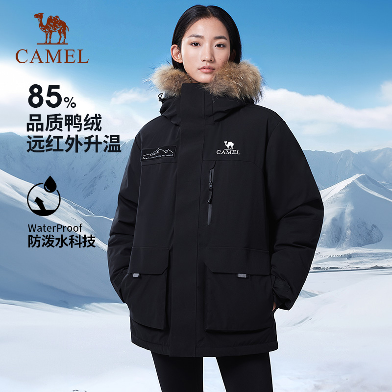 骆驼派克羽绒冲锋衣男女2024冬季防水保暖拼色工装外套连帽羽绒衣