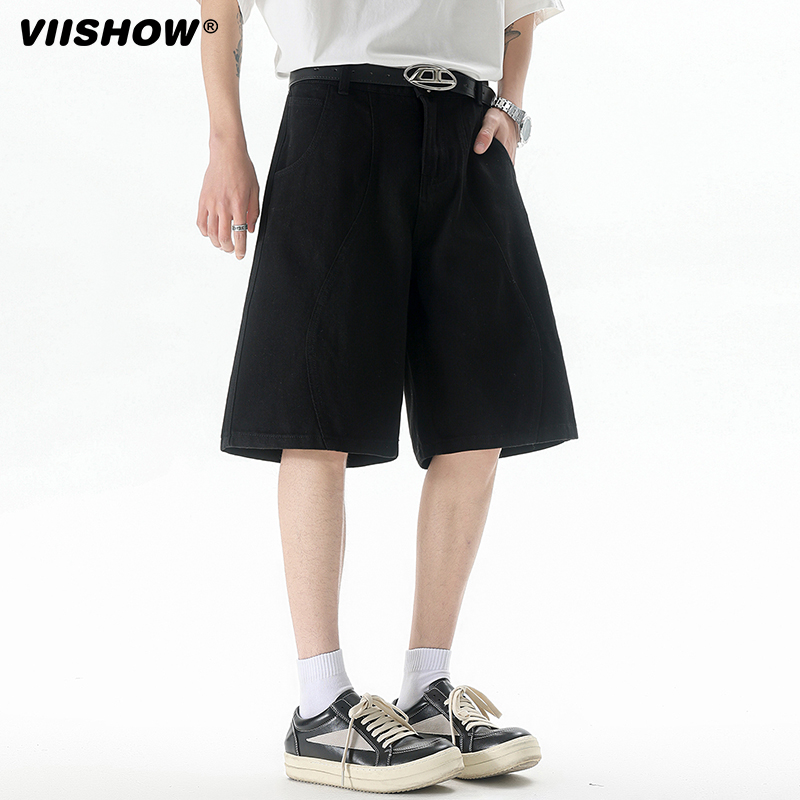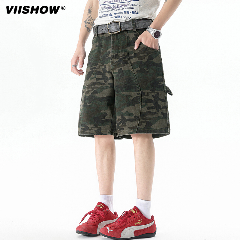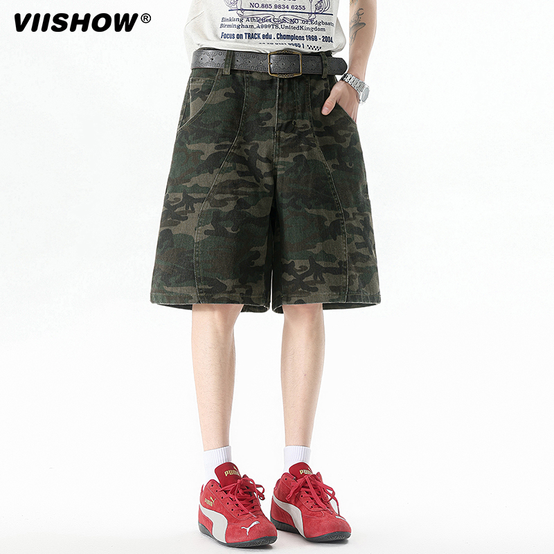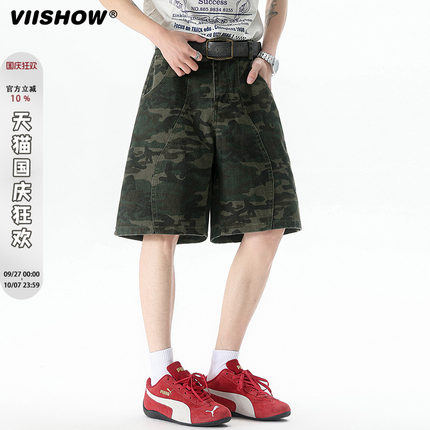 VIISHOW潮牌美式复古解构拼接迷彩牛仔短裤男夏季宽松百搭五分裤