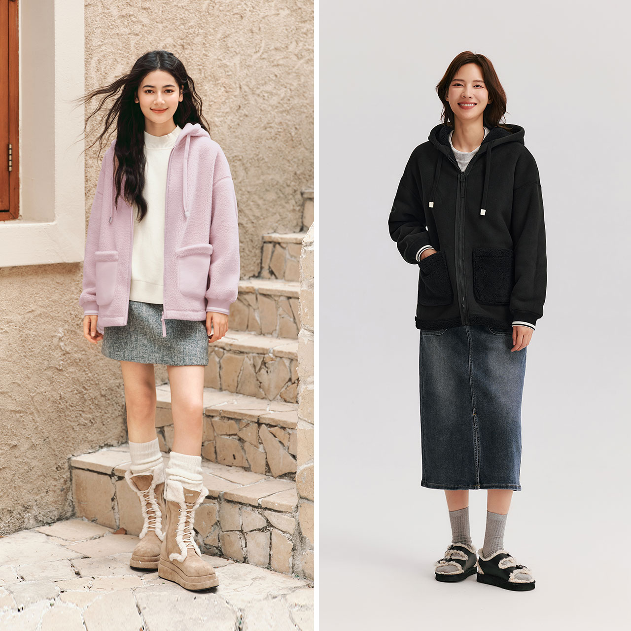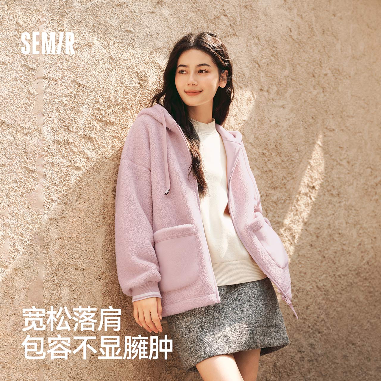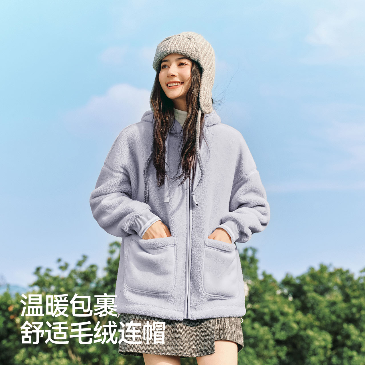 森马外套女仿摇粒绒初冬黑色连帽羊羔绒宽松2024冬新款厚外套夹克
