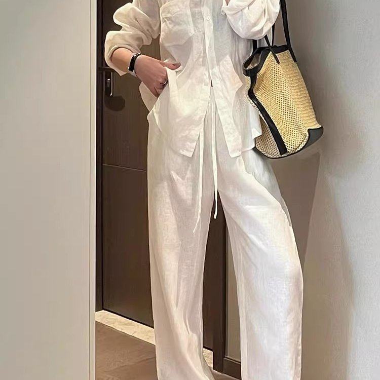 网图初秋白色亚麻老钱风衬衫女夏季宽松显瘦高端棉麻衬衣长袖上衣