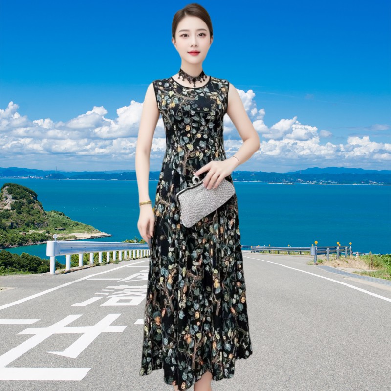 吊带背心连衣裙女夏季2025冰丝大码妈妈印花遮肚显瘦大摆内搭长裙