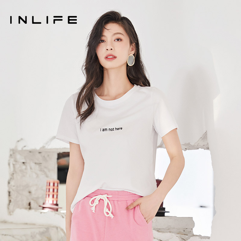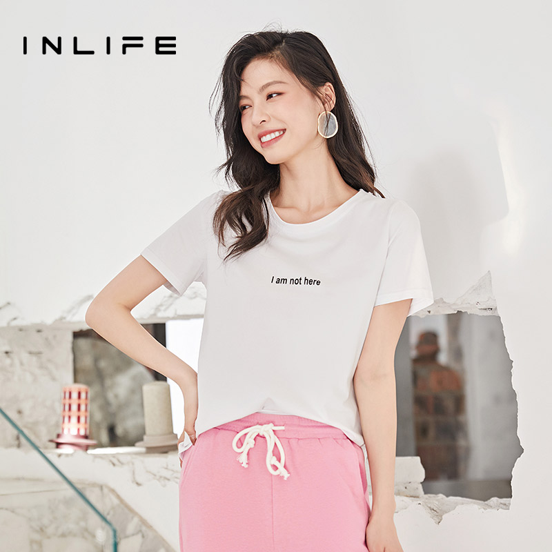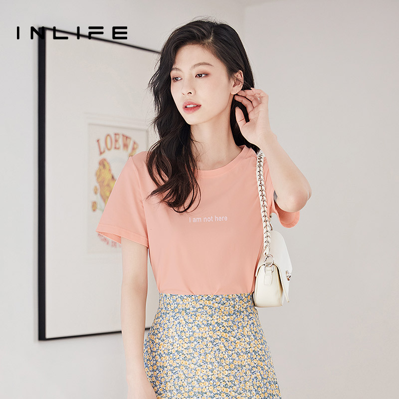 伊纳芙2025新款女装短袖t恤女夏字母印花宽松韩版ins潮圆领上衣