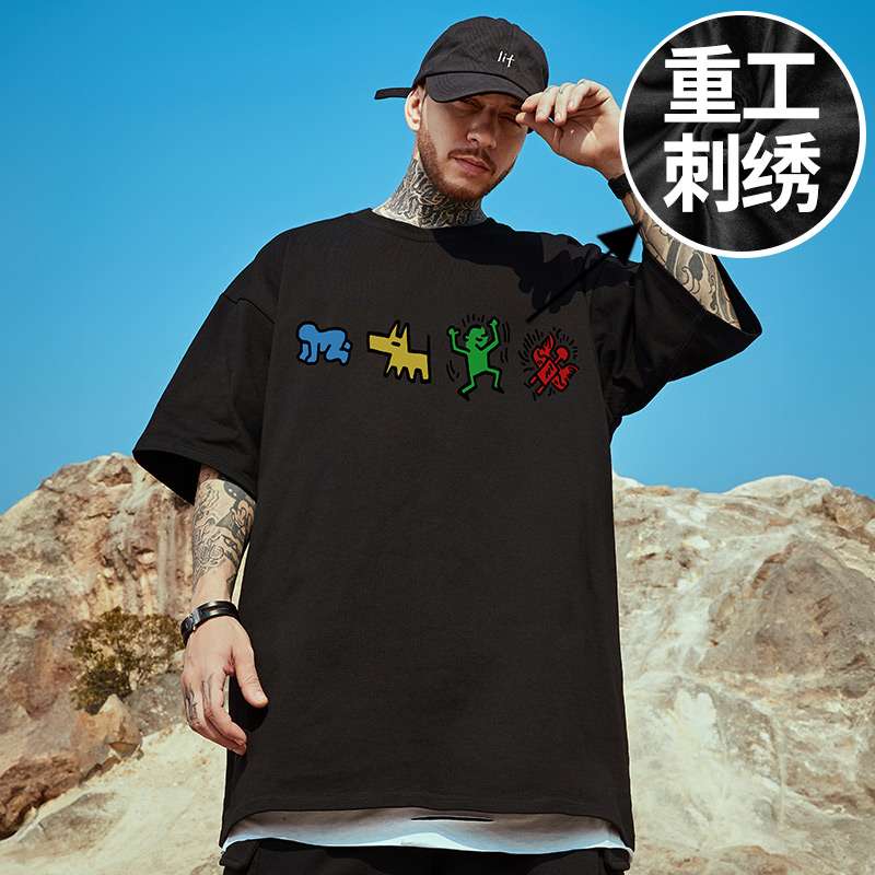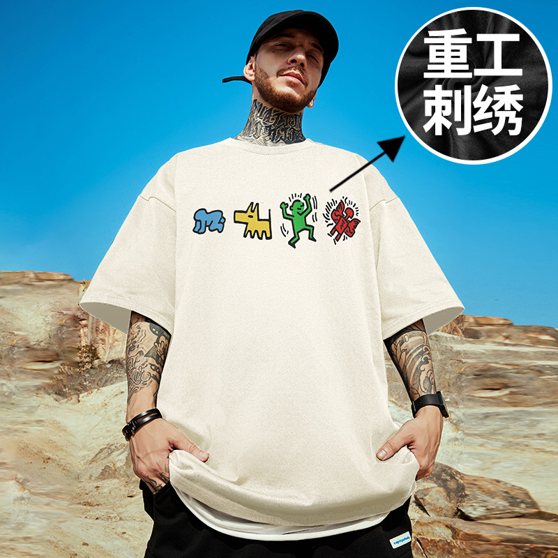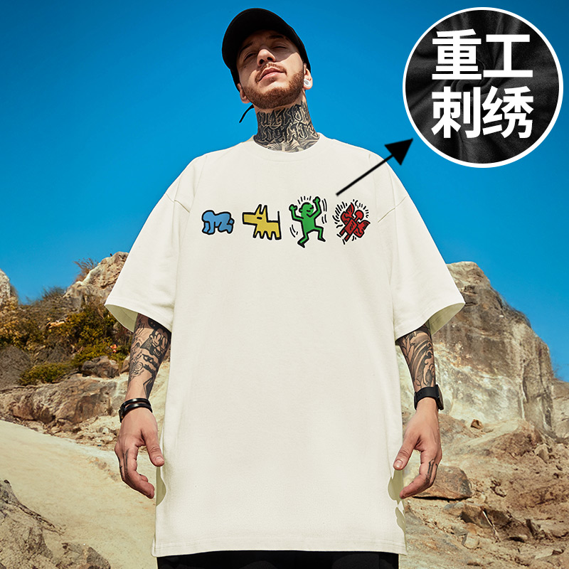 刺绣短袖T恤男美式重磅潮牌纯棉白色情侣款加肥加大码夏季半截袖