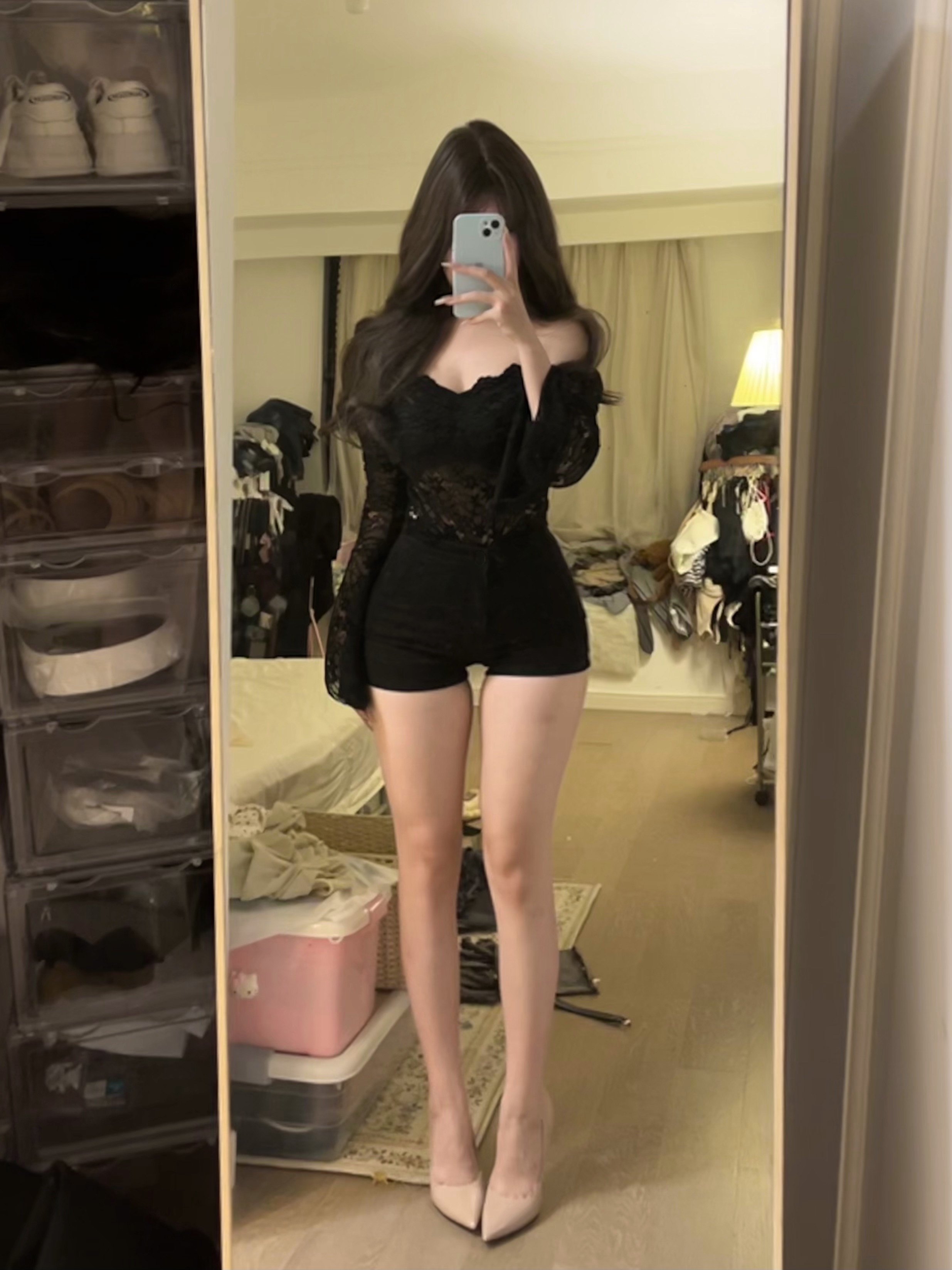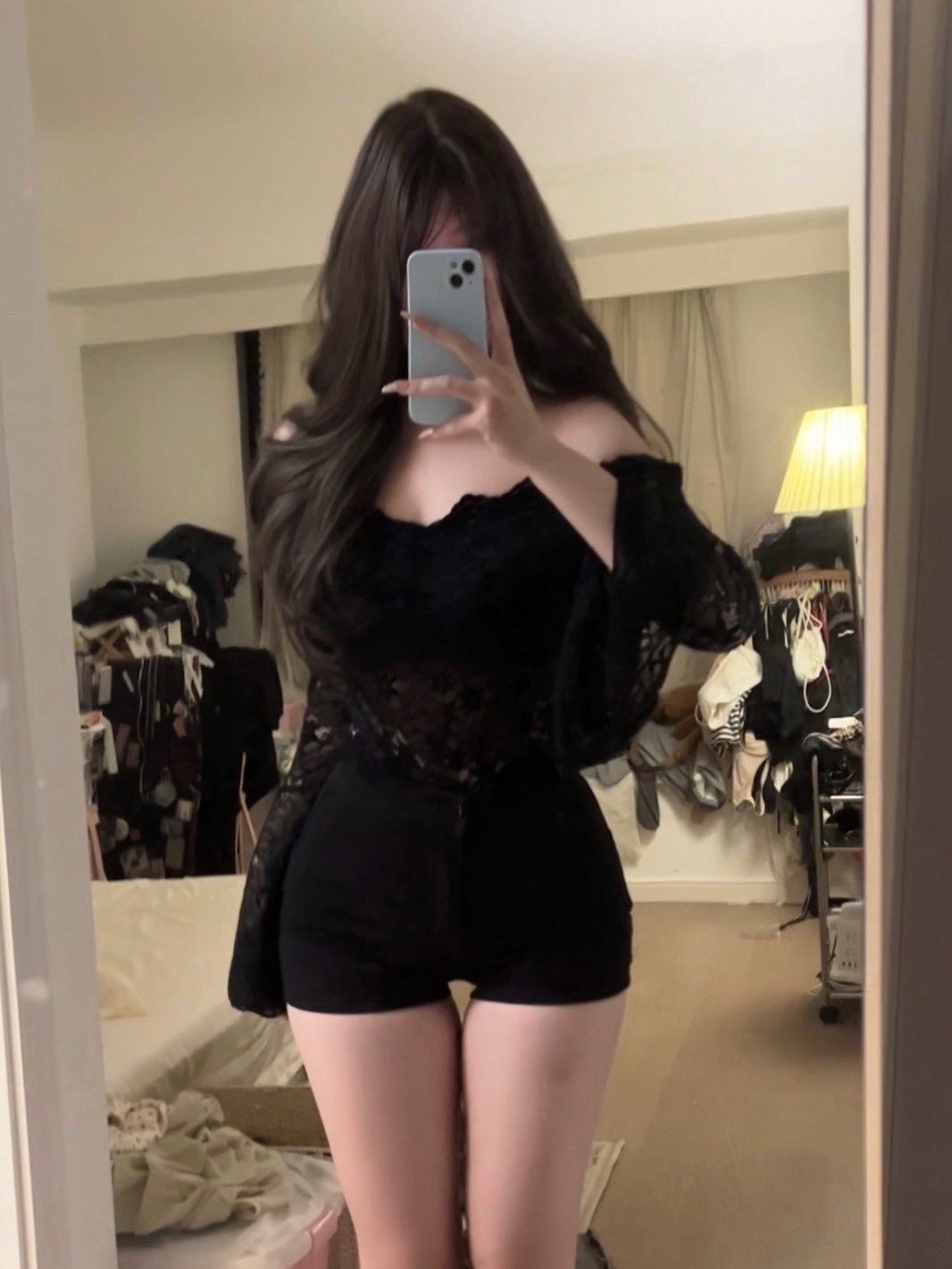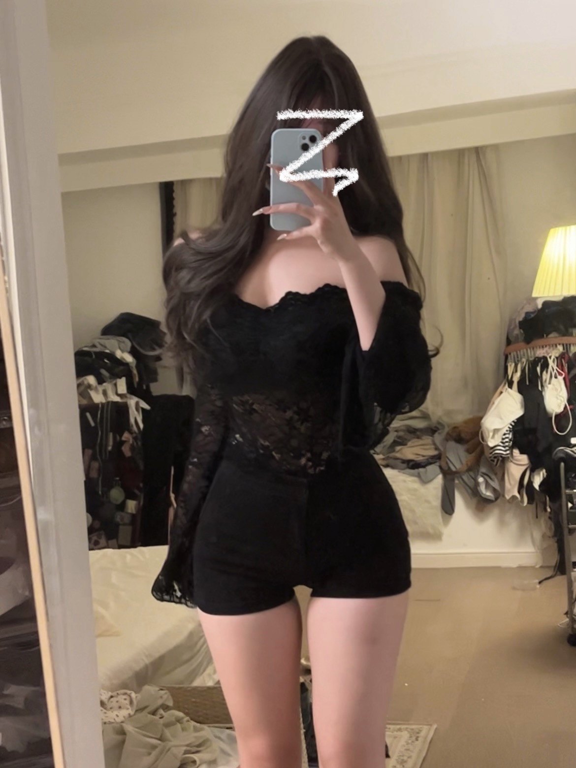 荔枝爱睡觉 |纯欲韩系姐姐蕾丝斩男一字肩喇叭袖镂空上衣短裤套装