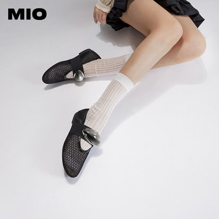 MIO米奥秋新单鞋平底鞋镂空渔网玛丽珍一字扣带芭蕾舞鞋女鞋