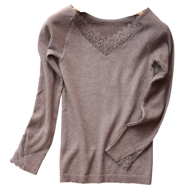 精梳棉毛圈绒保暖秋冬女打底衫V领上衣长袖修身蕾丝内搭加厚高弹